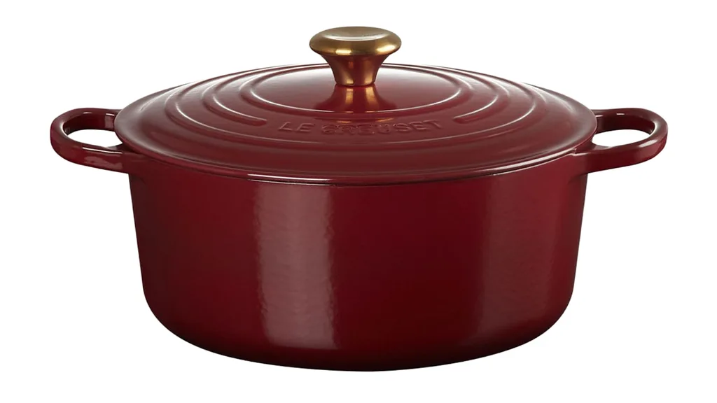 Le Creuset signature round casserole dish in Garnet with Gold Knob