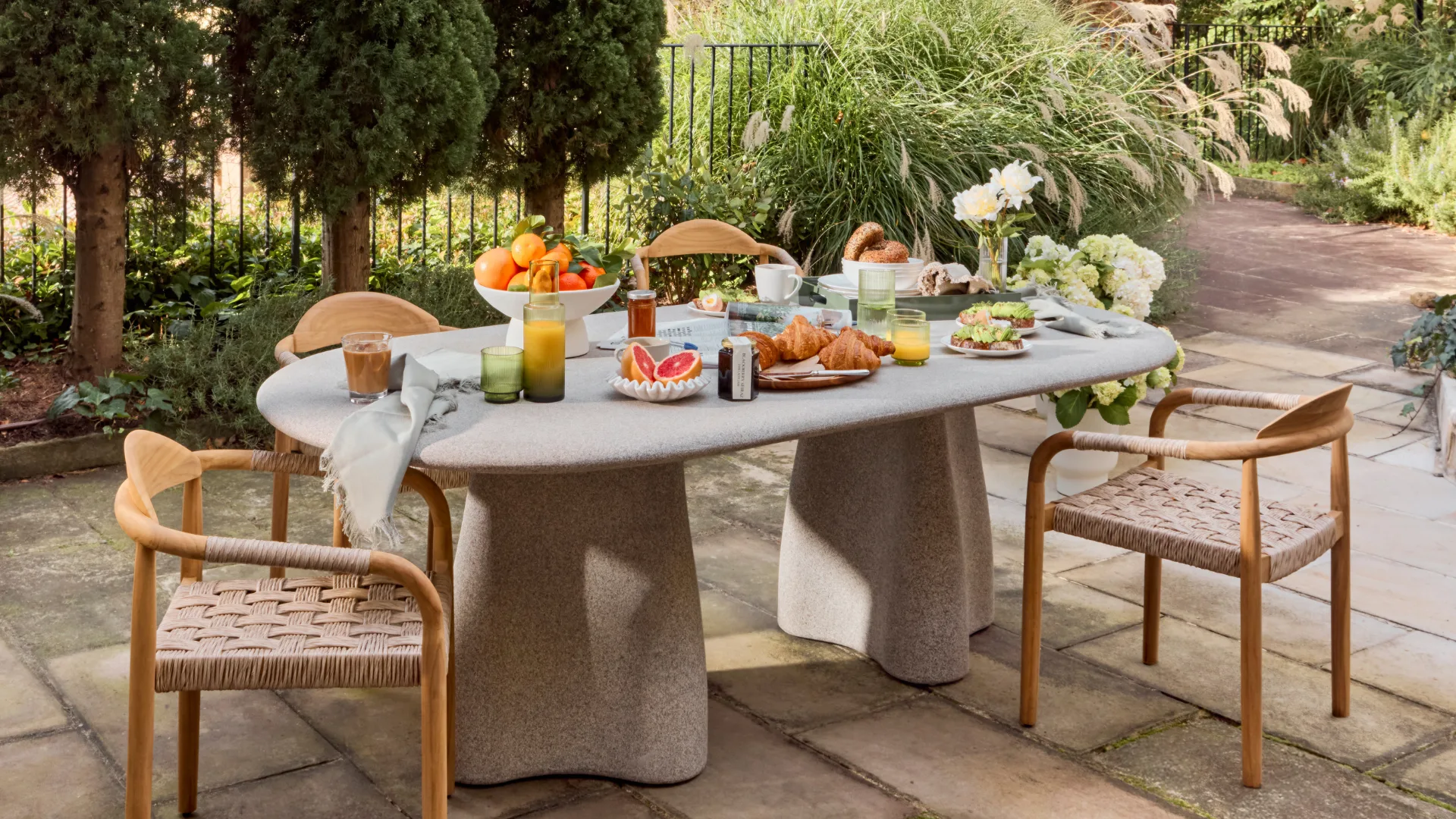Choose weather-proof materials such as sustainable teak, concrete, or outdoor wicker for tables and chairs. Natural tones and curved silhouettes are always a great option. Opt for pieces that work with the size of the space, and then layer accents such as plush cushions and outdoor-friendly dinnerware for hosting all season long.