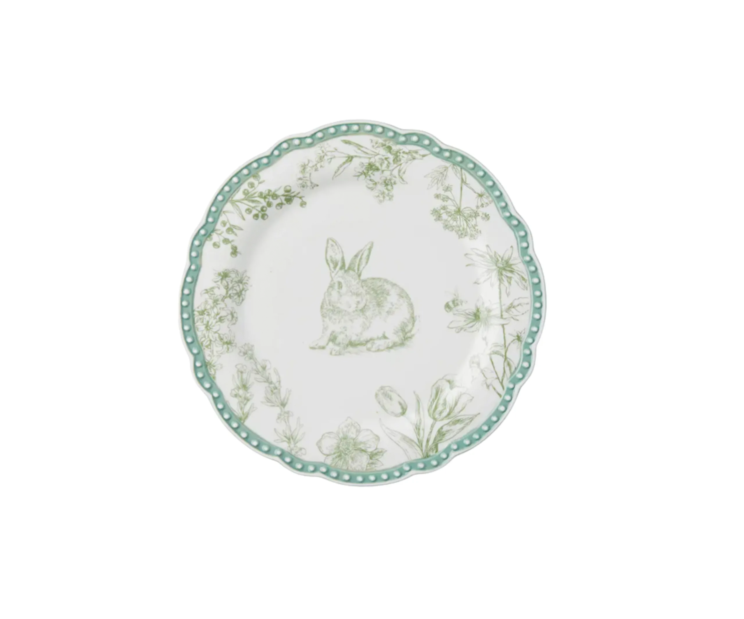 Add a touch of elegance to your Easter dining table setting with the soft green tones in this nature-inspired plate design with flowers and bunnies.