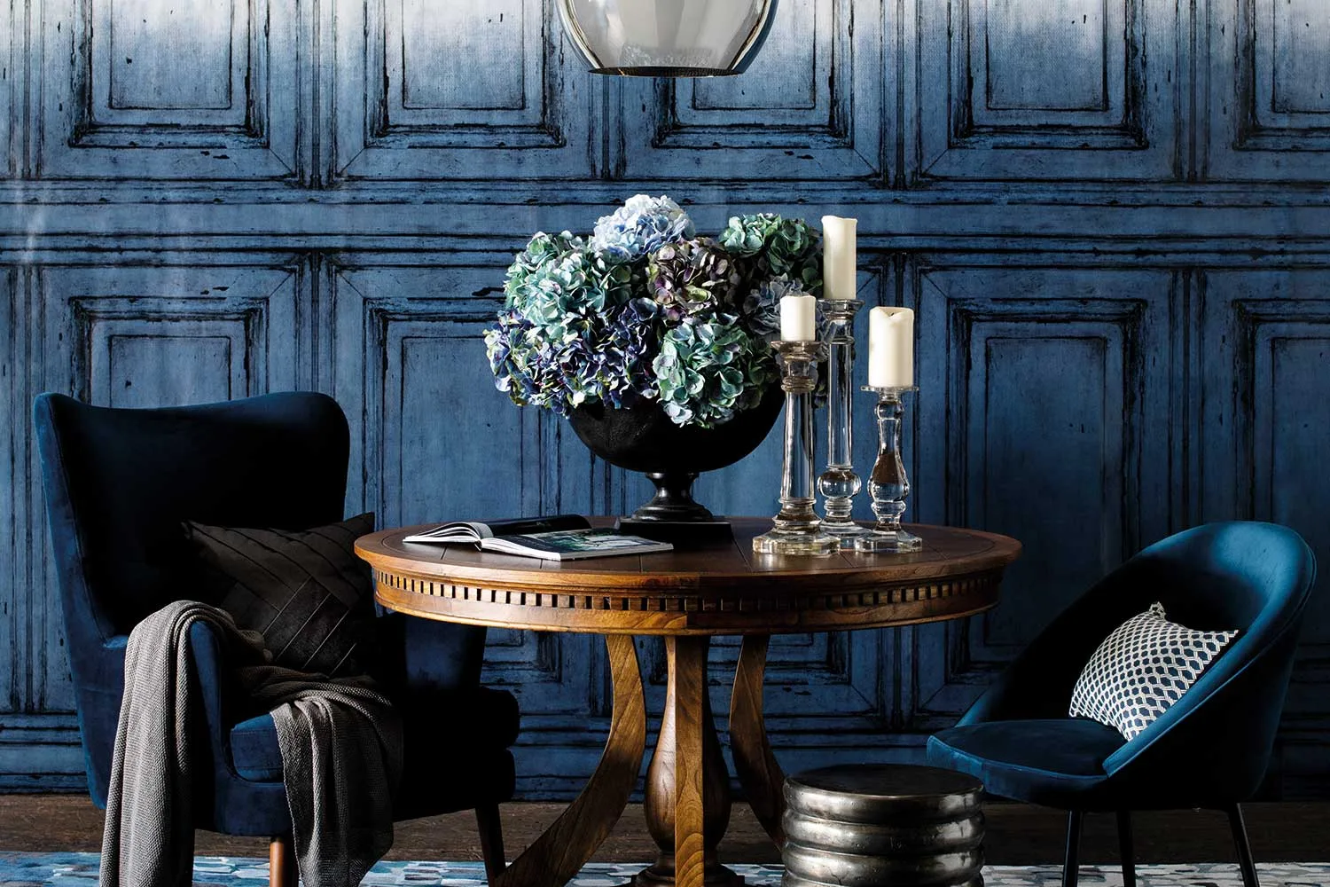 Blue in all its glory forms the elegant backdrop to modern-day velvets and luxe metallics