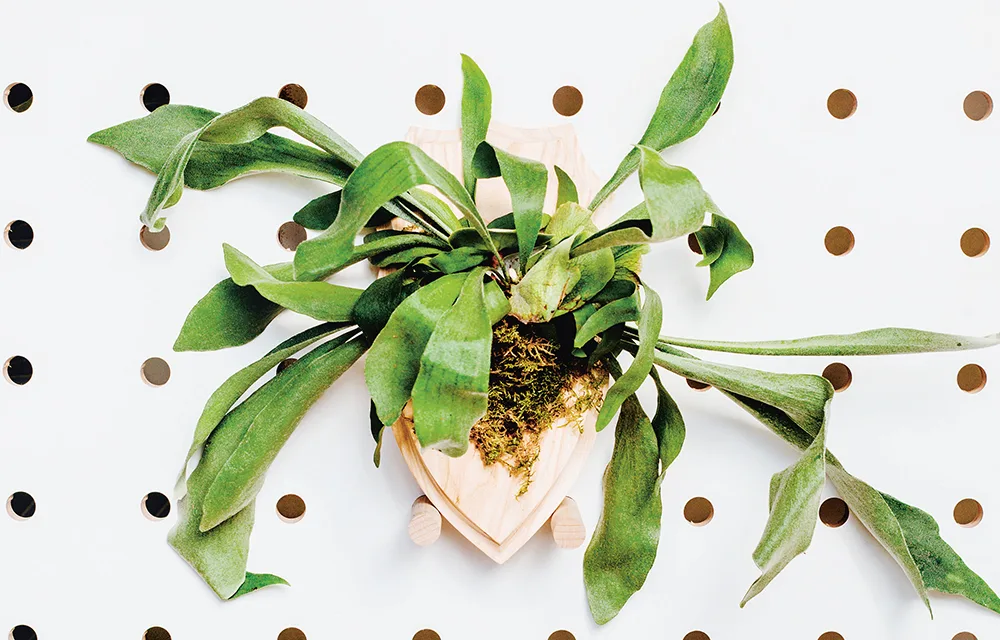 This is a fun, plant version of a mounted stag’s head; I have used a mount that is usually used in taxidermy for mounting real stag’s heads, but you can use a piece of recycled wood if you prefer. Hang the staghorn fern plaque somewhere prominent in your house, for example, above a fireplace, as a taxidermy stag’s head would be mounted.