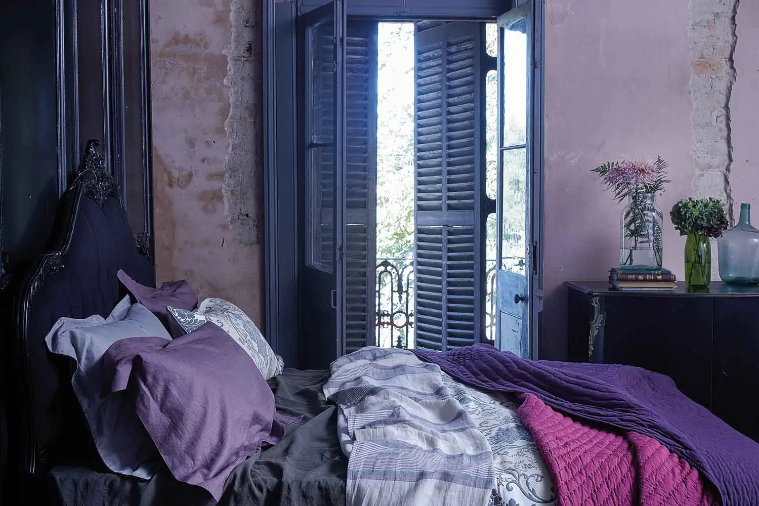 Give purple a romantic Parisian feel with an antique style bedhead and layers of decadent linen