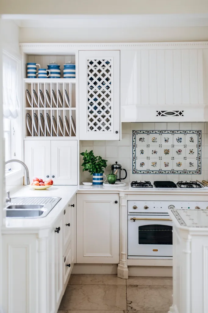 The splashback and island benchtop tiles were added during a previous renovation more than two decades ago (for similar tiles, try ‘Garden Blanc Green Corners’ handpainted tiles from Aeria Country Floors). The blue tiled border ties in perfectly with the Corningware and vintage items displayed on the shelves.
