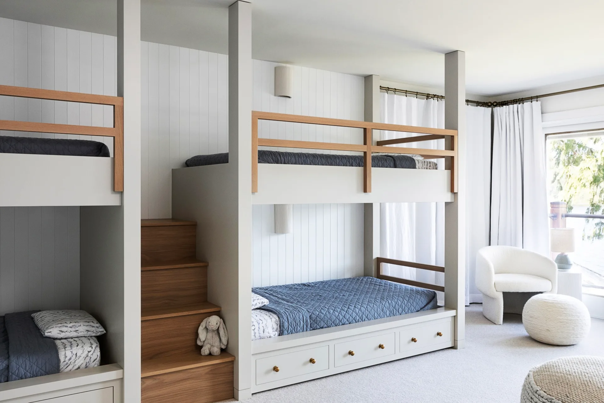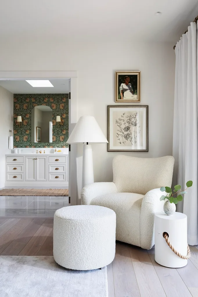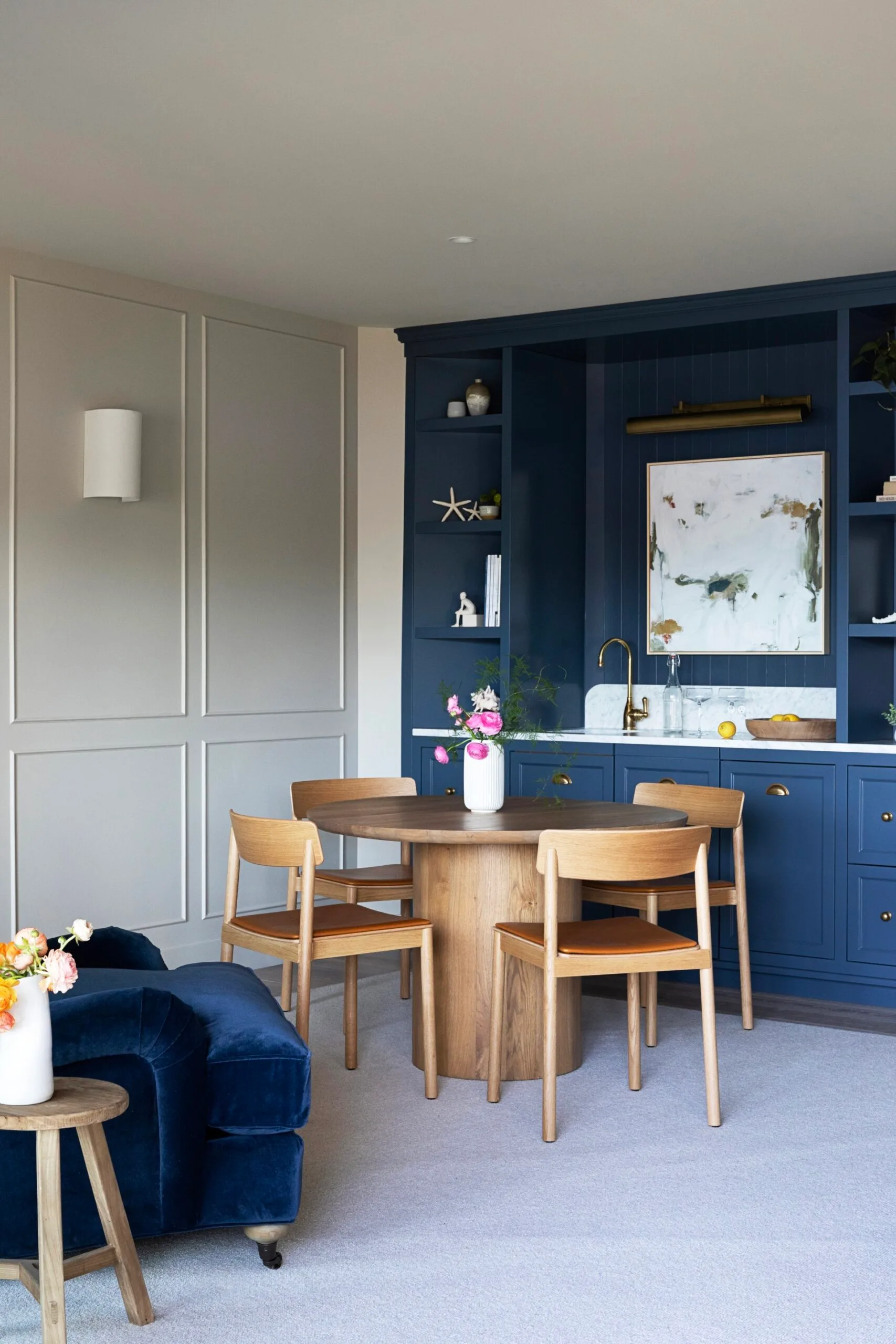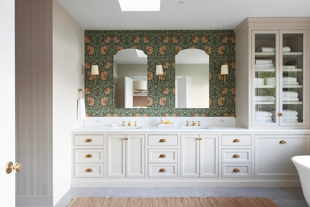 “We opted for medium ash oak wood flooring and a lighter whitewash oak for the tall millwork cabinets, paired with painted bone-coloured kitchen cabinets and white walls throughout,” describes the interior designer, who also incorporated finishes like a William Morris wallpaper in the primary bathroom for a playful twist. “The exception is the games room, where we introduced navy blue, and the kids’ bathroom, which features light blue.”