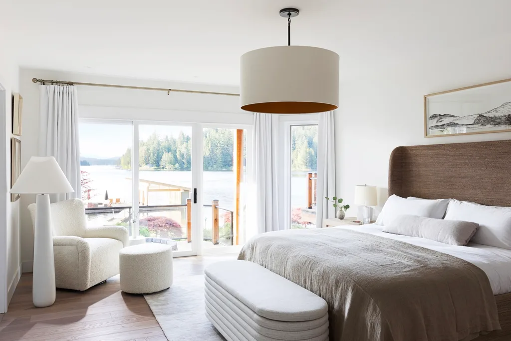 The large central pendant is just one of the many light sources in this room, including the natural light that comes streaming in through the floor-to-ceiling windows looking out onto the lake. By night, the whole room can be lit up by the central pendant, just the corner nook can be illuminated with the floor lamp from CB2 or you can read in bed by the bedside light. This all makes it easy to create zones.