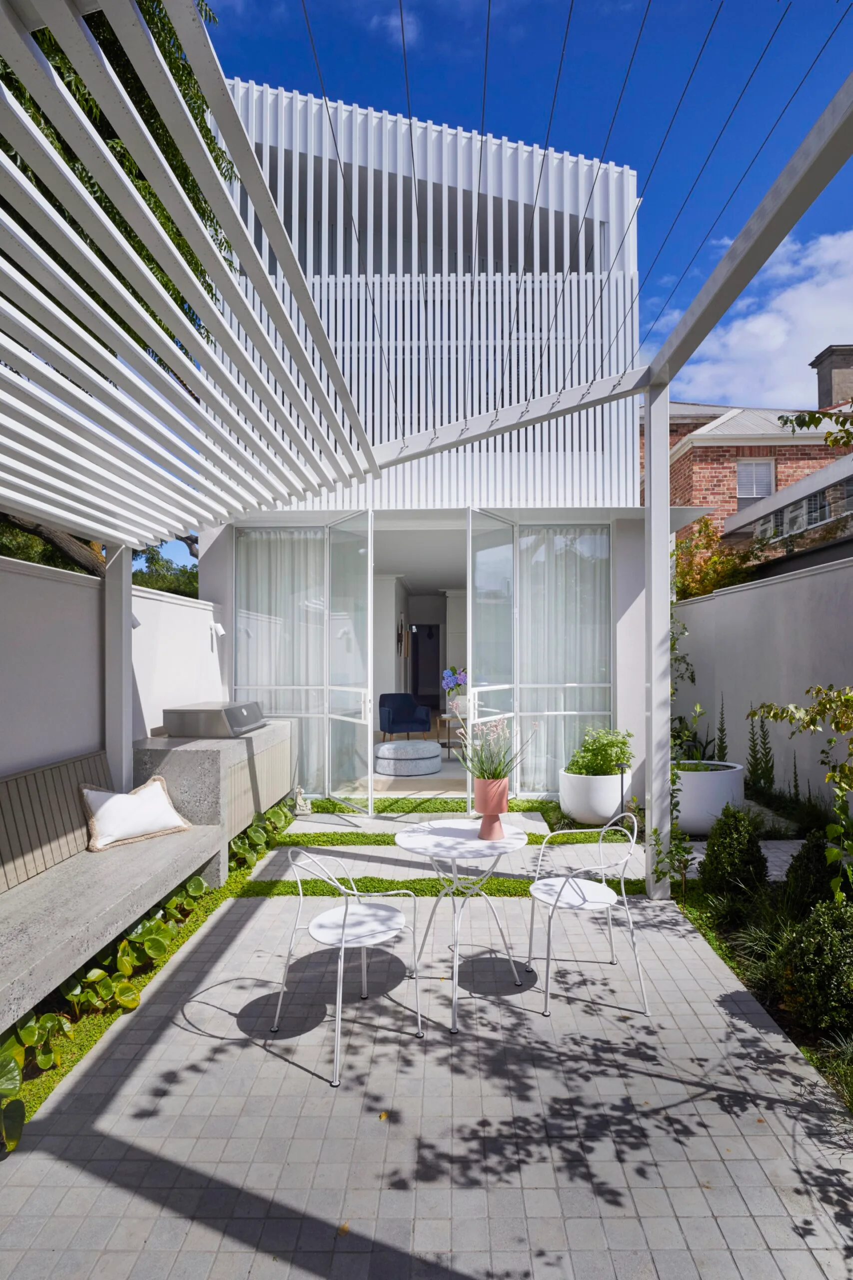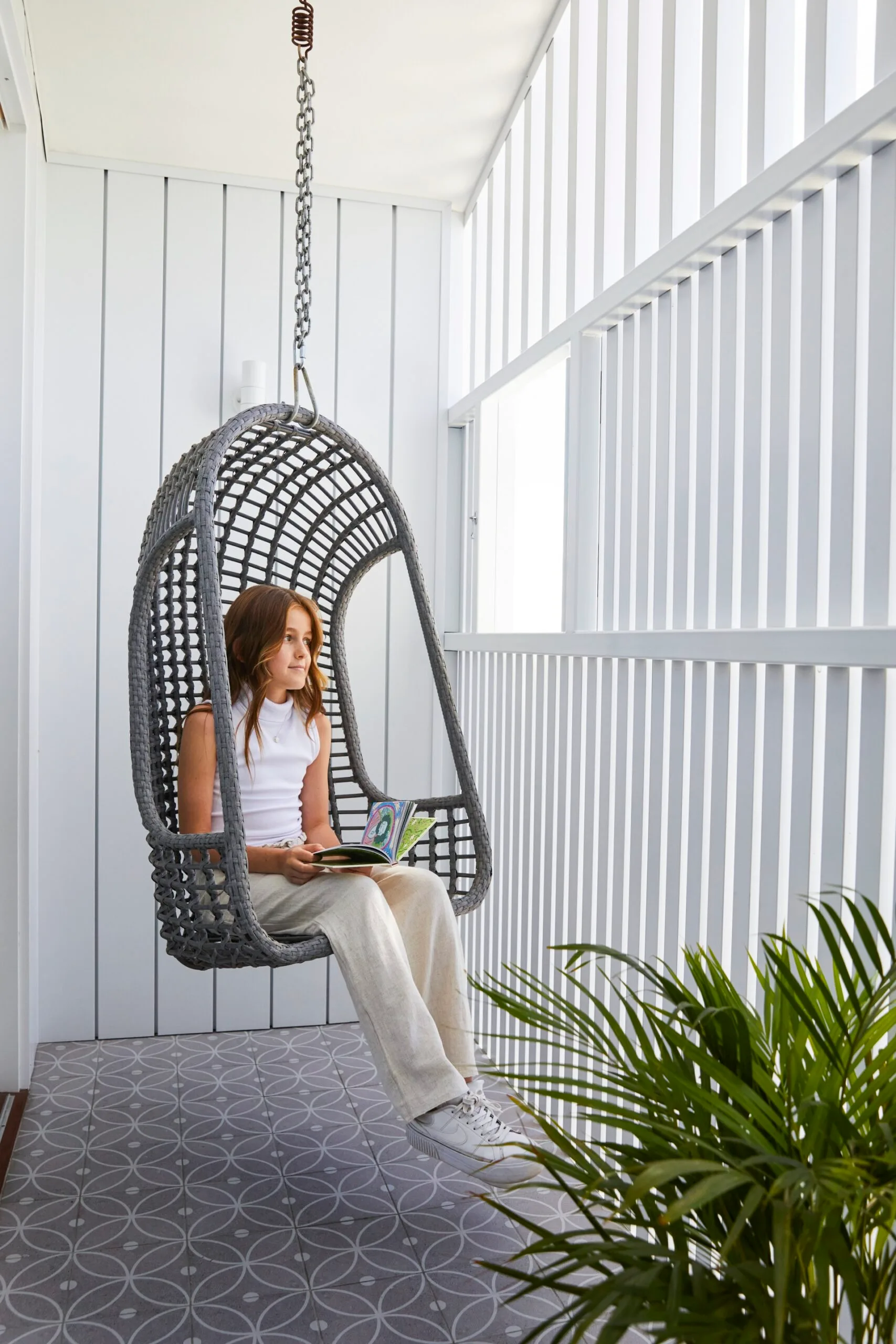The paved outdoor space designed by Landart features a Classic With a Twist outdoor setting and a striking pergola that ties in with the rear extension. (Credit: Photography: Armelle Habib/ Styling: Heather Nette King )Emily swings on an Aura Home hanging chair on her balcony, which is lined with Tiento tiles. “She has the best view to wake up and fall asleep to,” says Kelly. (Credit: Photography: Armelle Habib/ Styling: Heather Nette King )