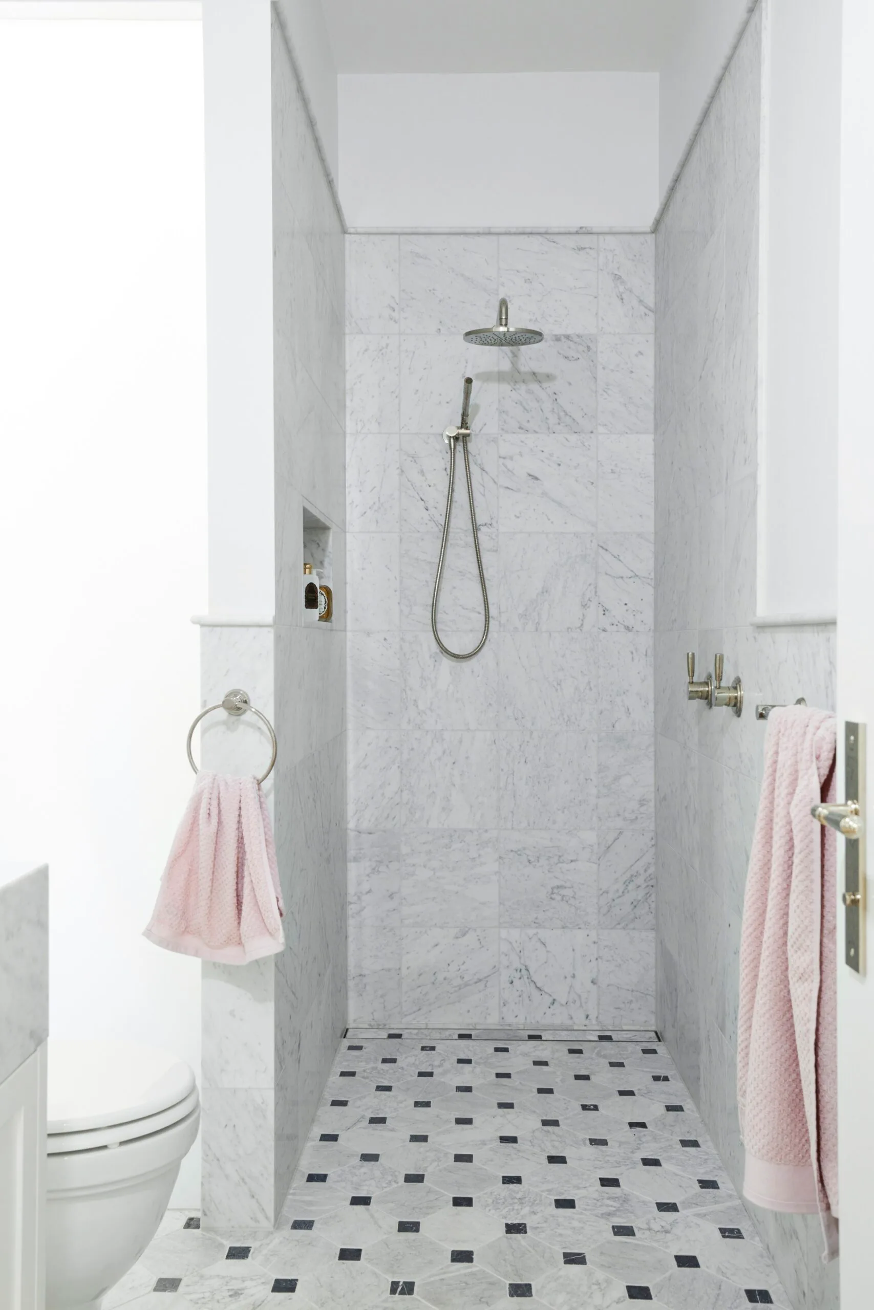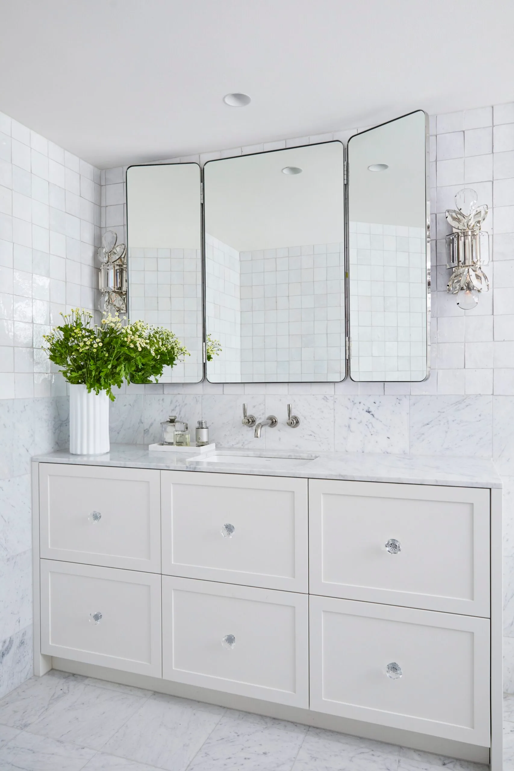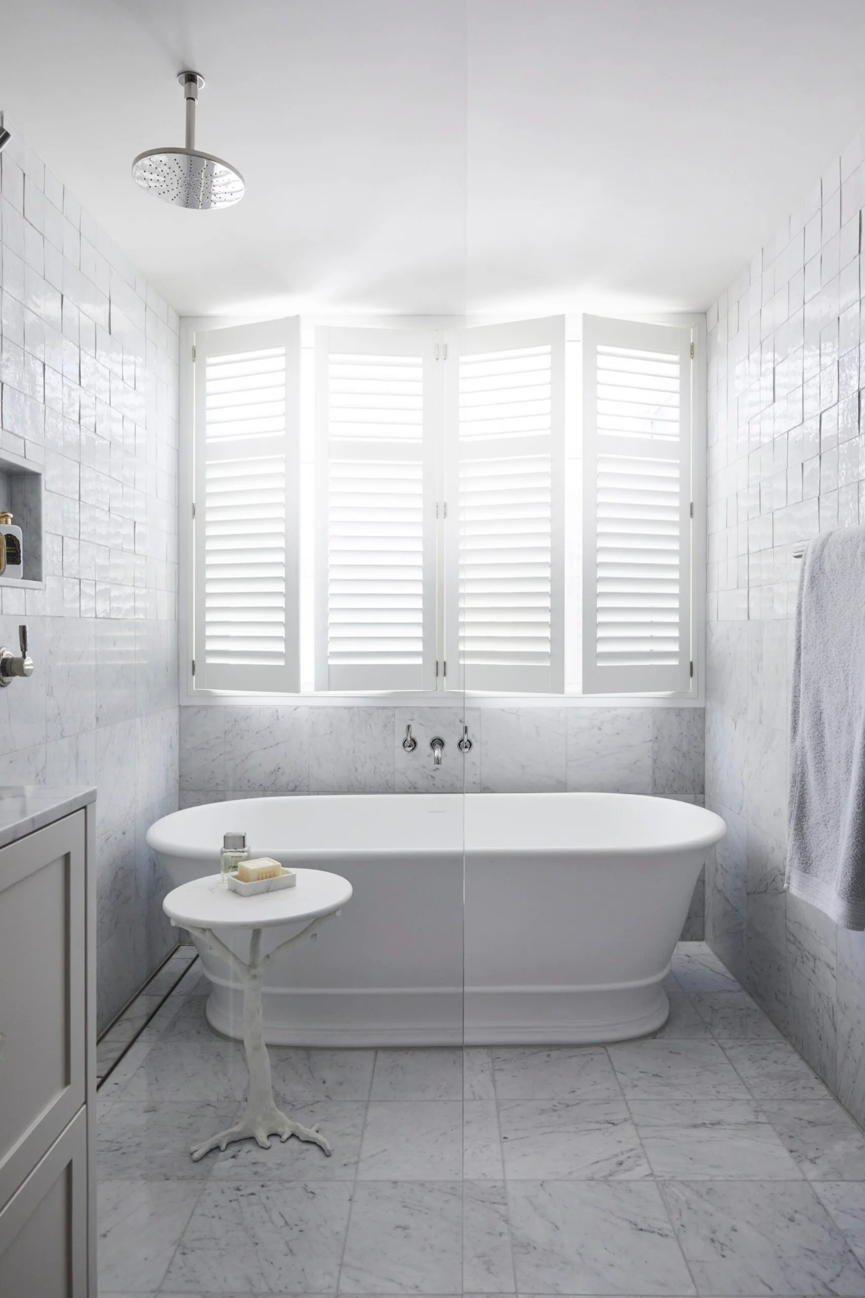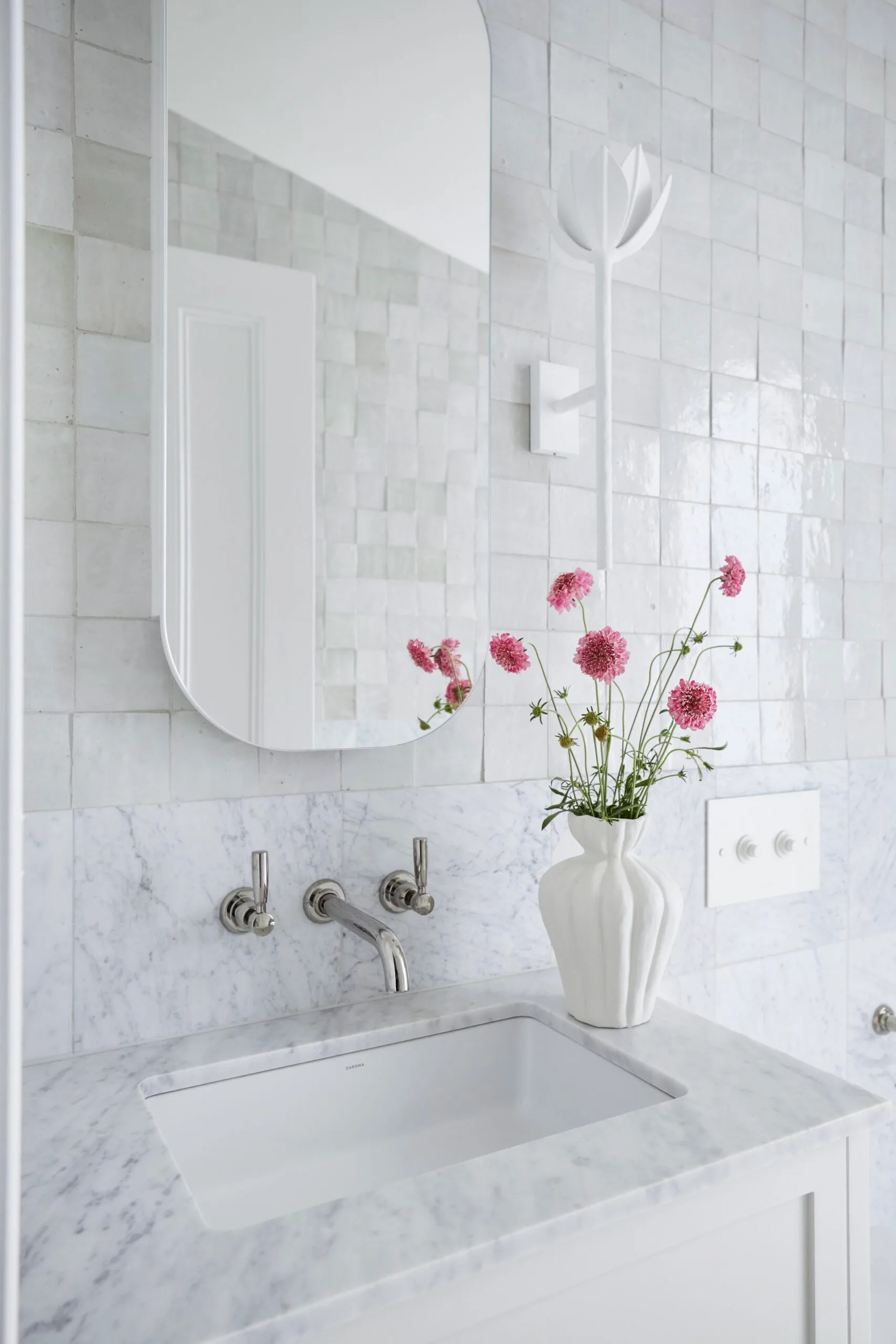 A Turner Hastings ‘Cambridge’ freestanding bath from The Blue Space takes centre stage below the window. Tapware and fixtures by Brodware. (Credit: Photography: Armelle Habib/ Styling: Heather Nette King ) ‘Lloyd’ large jewelled sconces flank the custom mirror by Ore Designs. (Credit: Photography: Armelle Habib/ Styling: Heather Nette King)Emily’s bathroom features ‘Dust’ zellige wall tiles from Tiles of Ezra, an ornate ‘Alberto’ wall sconce from Bloomingdales Lighting and a round-edged mirror from Timberline. Bathroom Tumbled Carrara tops the vanity and lines the walls and floors of the main bathroom, while the upper walls feature ‘Snow’ zellige tiles from Tiles of Ezra. (Credit: Photography: Armelle Habib/ Styling: Heather Nette King)In this space, Teranova ‘Juliette’ tumbled octagon floor tiles in Carrara and Nero Marquina add refined elegance to the shower area.