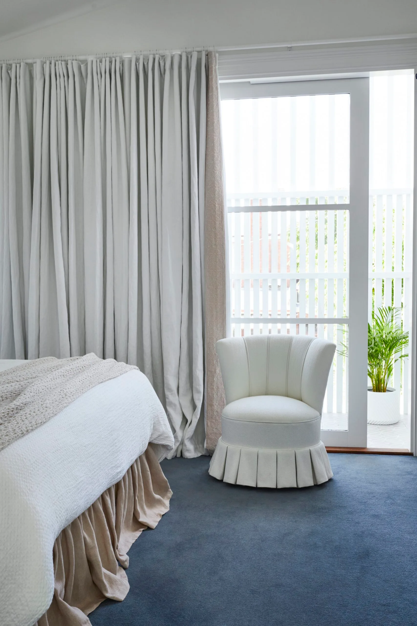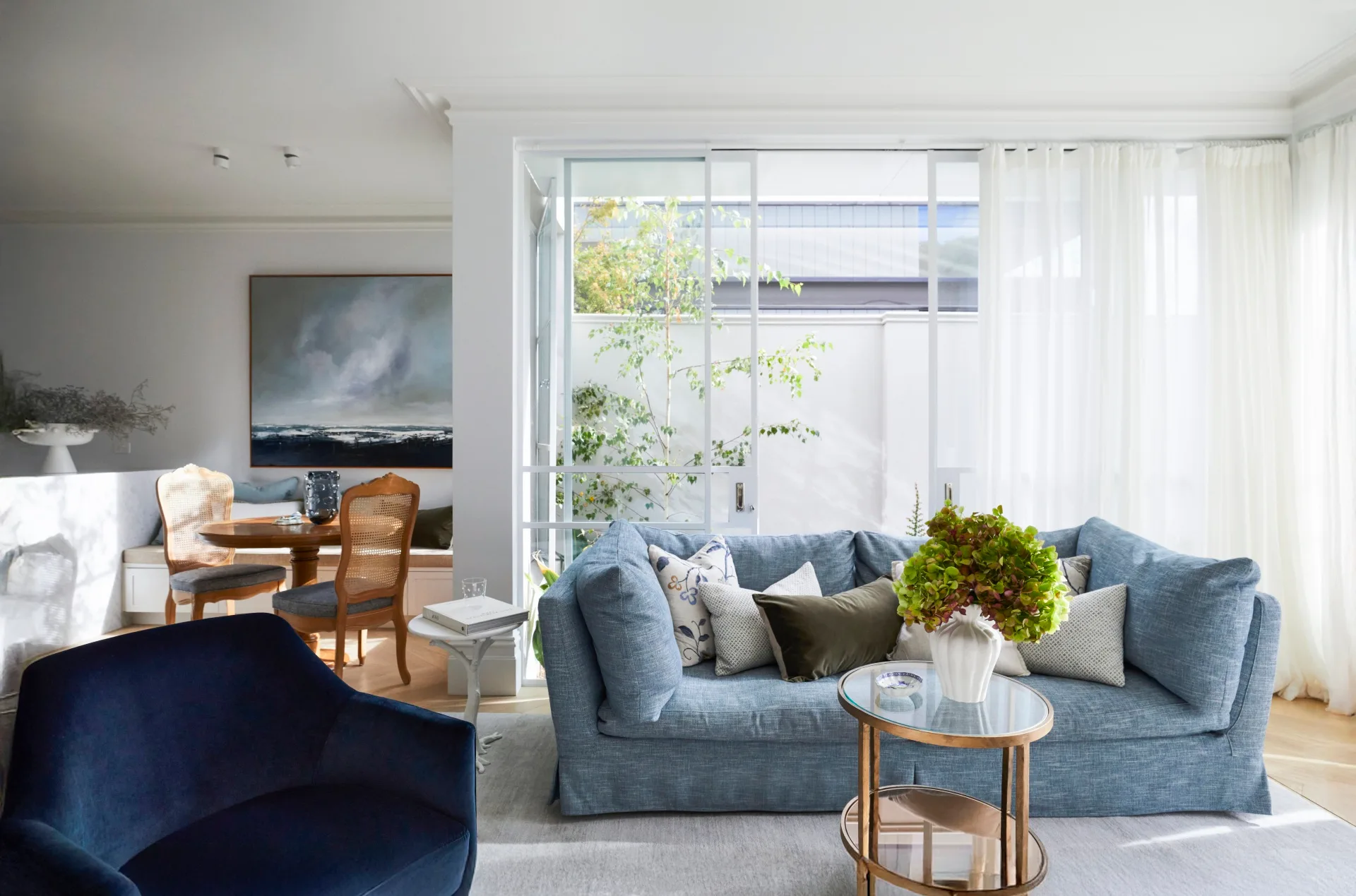 A Molmic ‘Lille’ sofa in the living area has Mokum ‘Sahel’ upholstery in Denim from James Dunlop Textiles, while the ‘Stanley’ armchair from Arthur G is covered in a dark blue Alhambra fabric from Elliott Clarke. Tying it all together is an Armadillo ‘Agra’ rug in Pearl, which is topped with an ‘Amphora’ brushed gold table from Boyd Blue and white side table from Cromwell. Sheer curtains in James Dunlop Textiles ‘Lino’ fabric filter the light beautifully through the sliding doors. (Credit: Photography: Armelle Habib/ Styling: Heather Nette King )