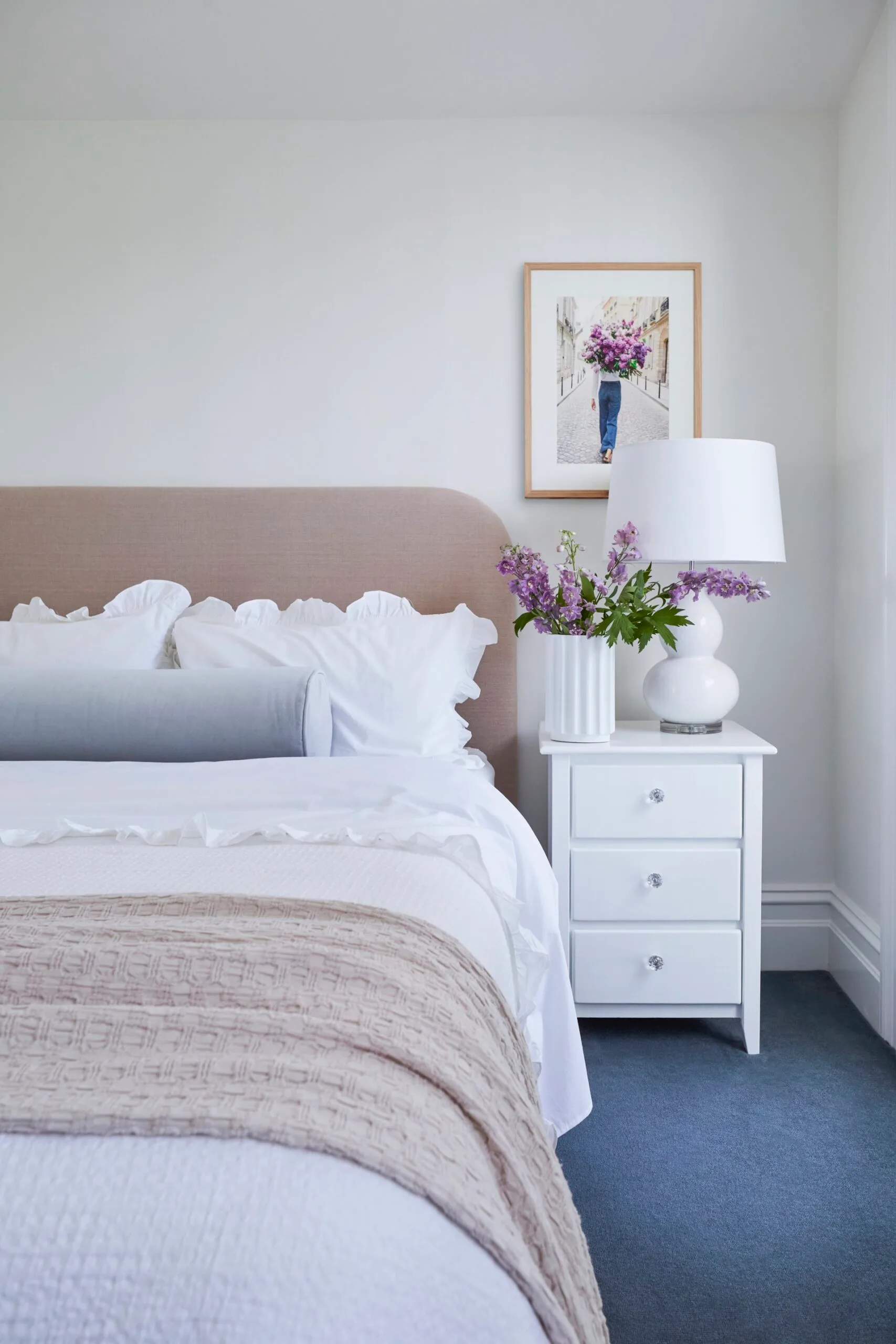 Wills Bisgrove ‘Thomas’ bedhead in Mokum ‘Infinite’ fabric in Blush and artworks, including ‘On My Way’ by Carla Coulson, lend a youthful edge. A bone inlay dresser from Ruby Star Traders, chair by Bloom in a crisp white linen fabric and ‘Jasmine’ table lamp from Bloomingdales Lighting are other special touches. (Credit: Photography: Armelle Habib/ Styling: Heather Nette King )
