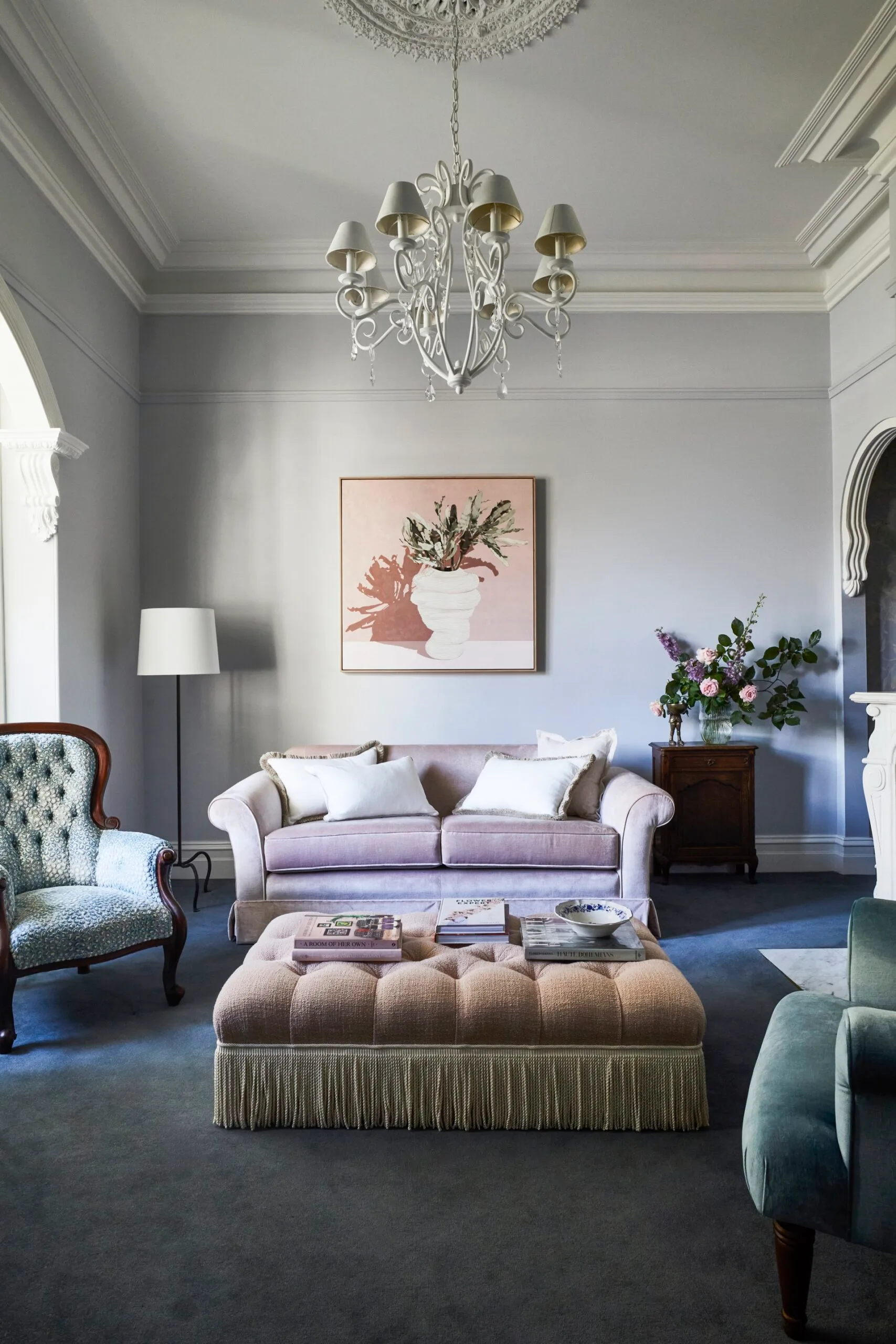 Kelly and Mark’s home, where they live with daughter Emily, is a study in grace that honours its heritage. In the sitting room, an existing sofa and armchairs were recovered in Mokum ‘Vintage Deux’ in Blush (sofa), Sky (armchair on right), and Colefax and Fowler ‘Wilde’ animal print in Old Blue (armchair on left). The ottoman has Manuel Canovas ‘Momas’ fabric from Domus Textiles and a Brunschwig & Fils ‘Le Coeur Passementerie’ trim from Elliott Clarke that echo the intricately detailed facade. (Credit: Photography: Armelle Habib/ Styling: Heather Nette King)