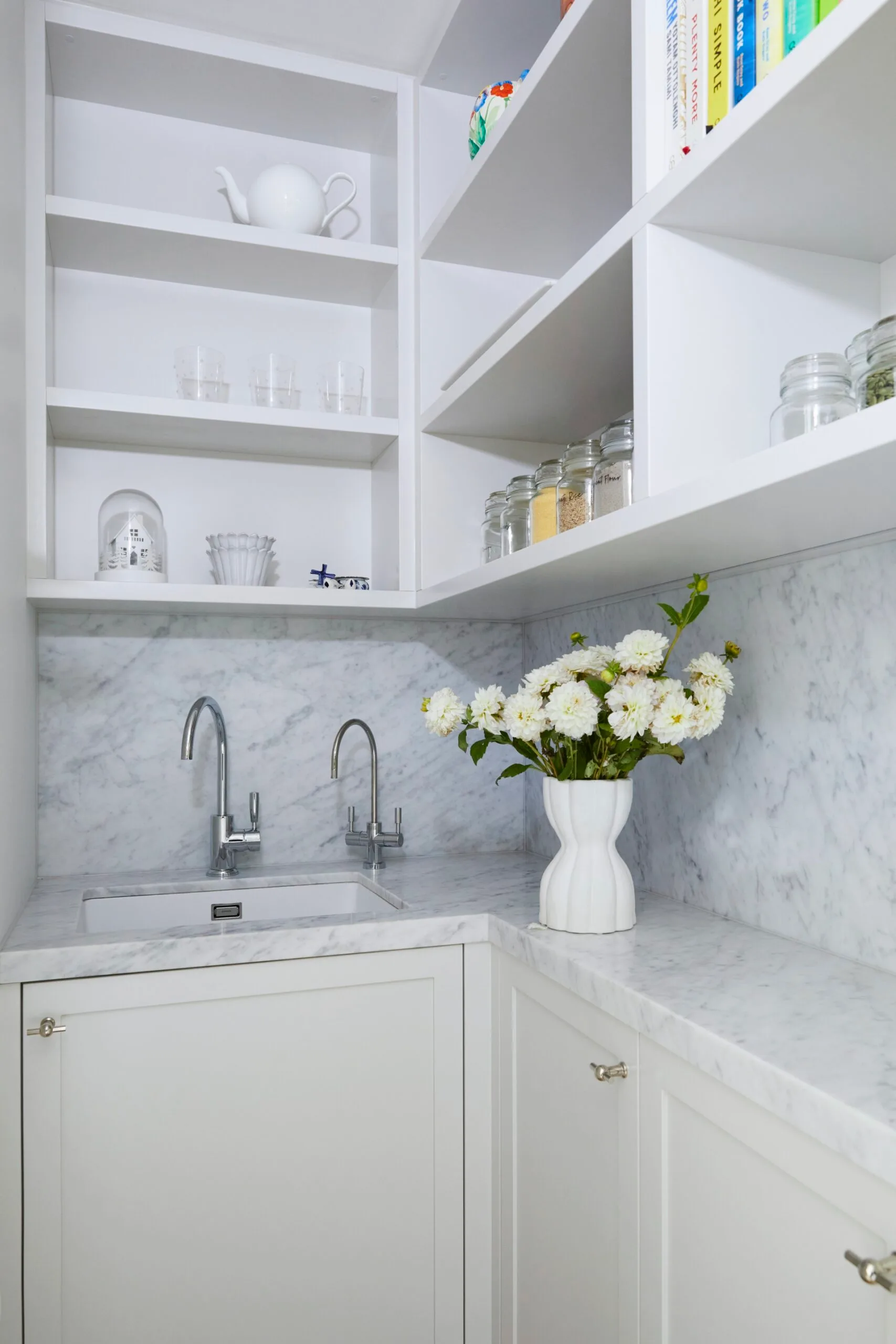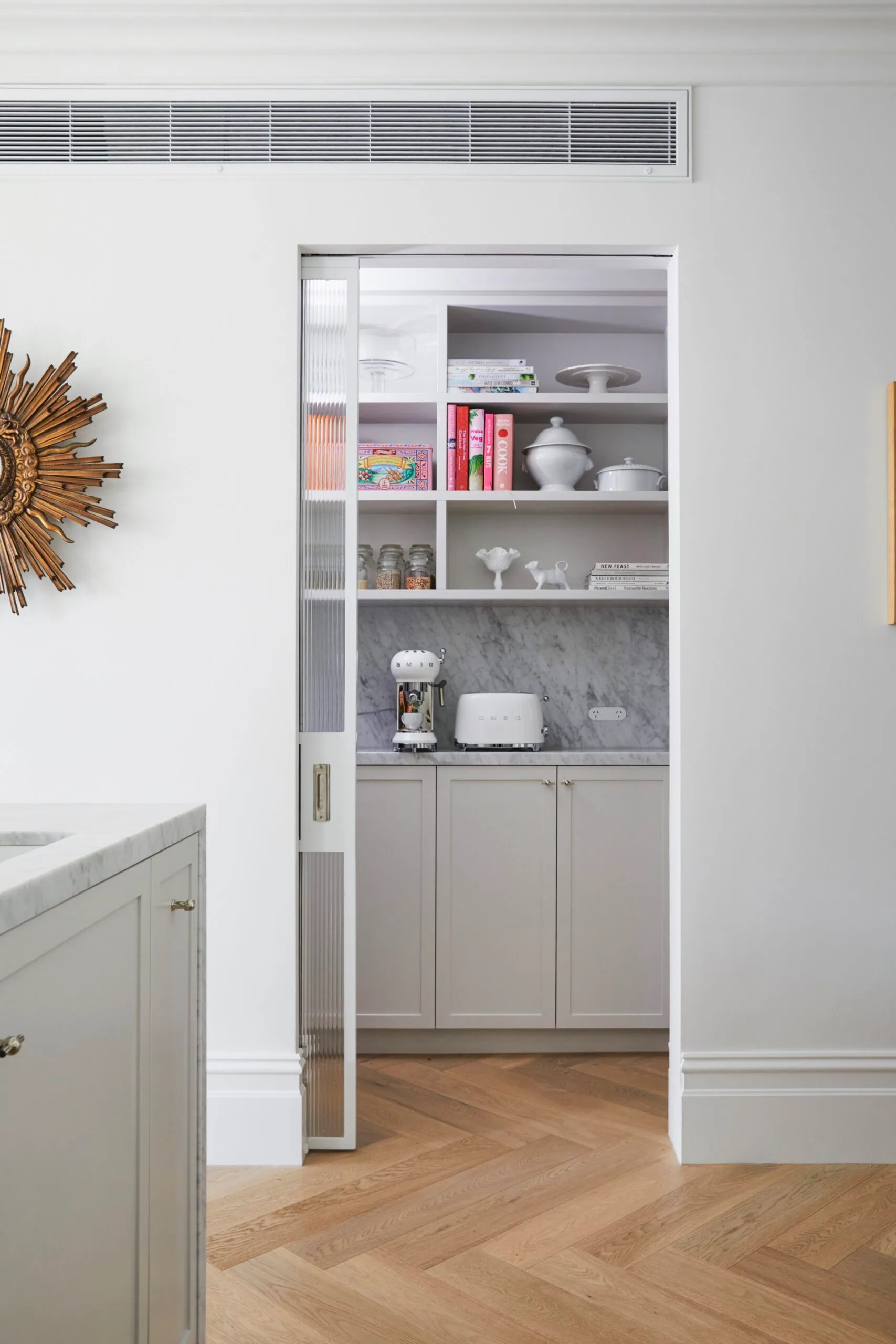 Sliding fluted glass doors keep any mess in the butler’s pantry out of sight. (Credit: Photography: Armelle Habib/ Styling: Heather Nette King )The butler’s pantry features the same joinery, benchtops and tapware as the kitchen, with a single Schock ‘Quadro’ sink. (Credit: Photography: Armelle Habib/ Styling: Heather Nette King )