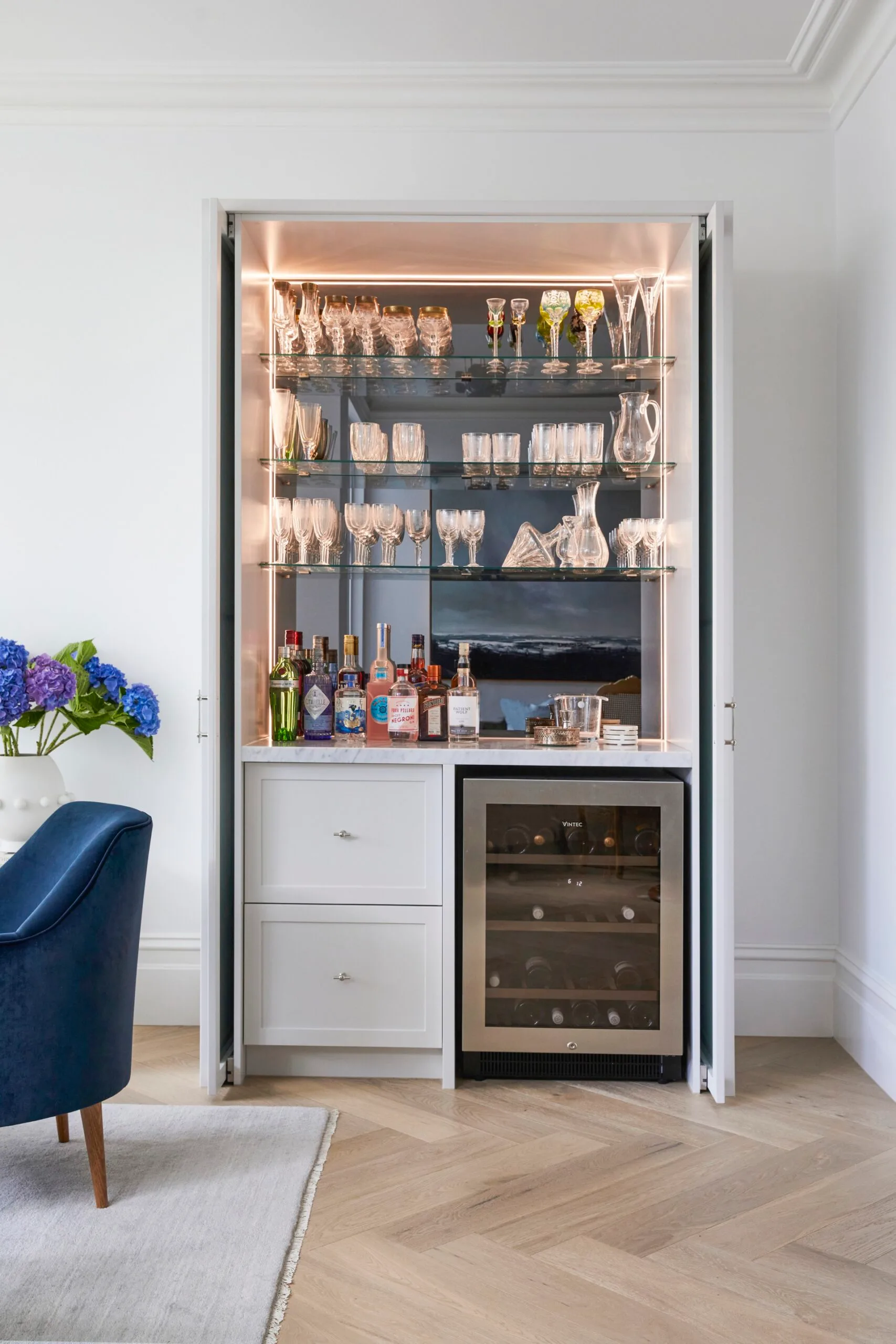 The two-pac joinery is in Dulux Lyttelton Quarter. “The drinks cabinet is a winner for Mark, who enjoys mixing up a cocktail or two when we entertain,” says Kelly. Fluted glass doors from Axess Glass and the Viridian mirrored glass splashback give it a luxe treatment. (Credit: Photography: Armelle Habib/ Styling: Heather Nette King )