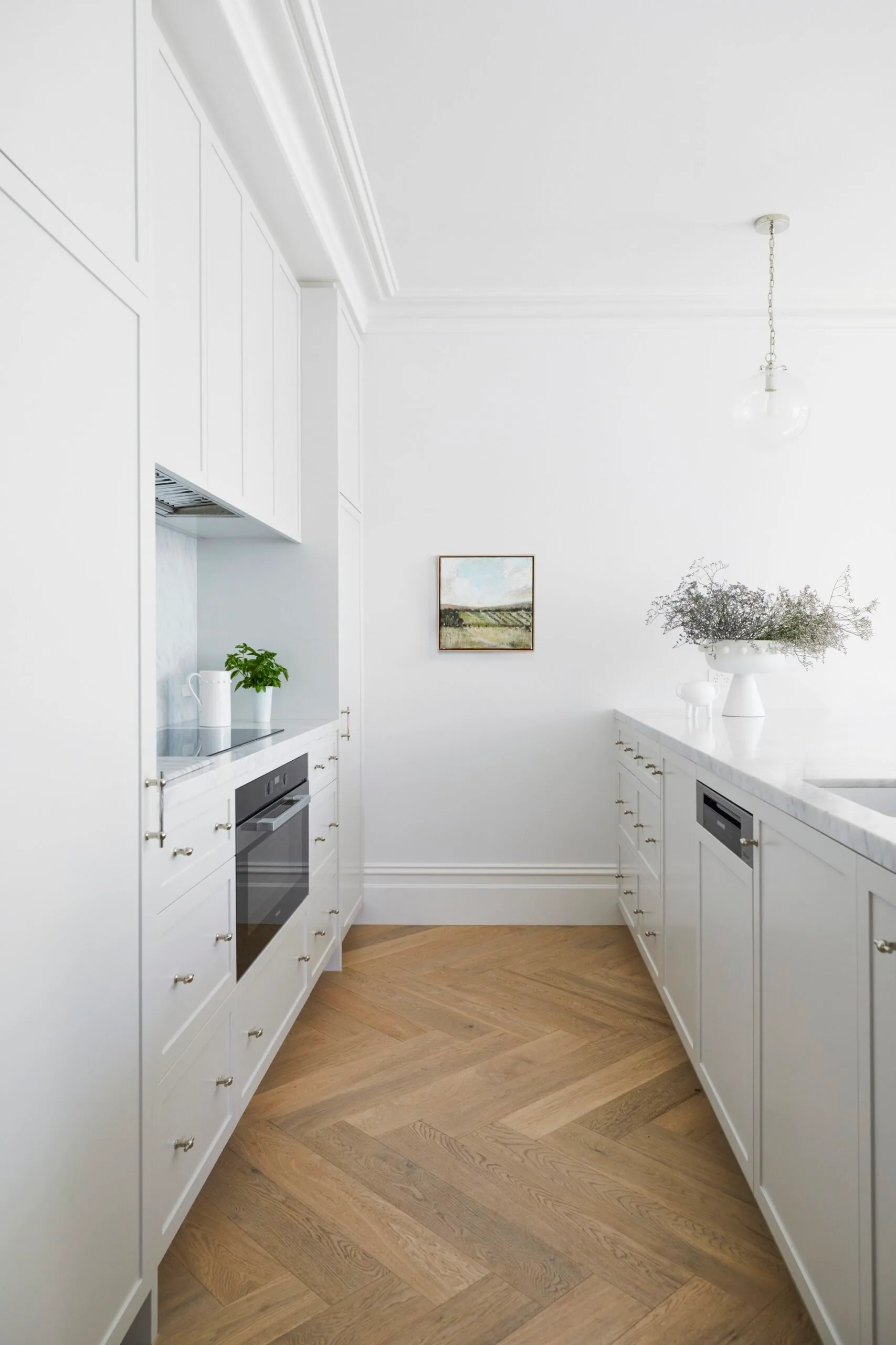 The kitchen is fitted with a Miele dishwasher, as well as a Schock ‘Quadro’ sink from Abey and a Brodware ‘Manhattan’ mixer. ‘Katie Globe’ pendants from Bloomingdales Lighting are above.