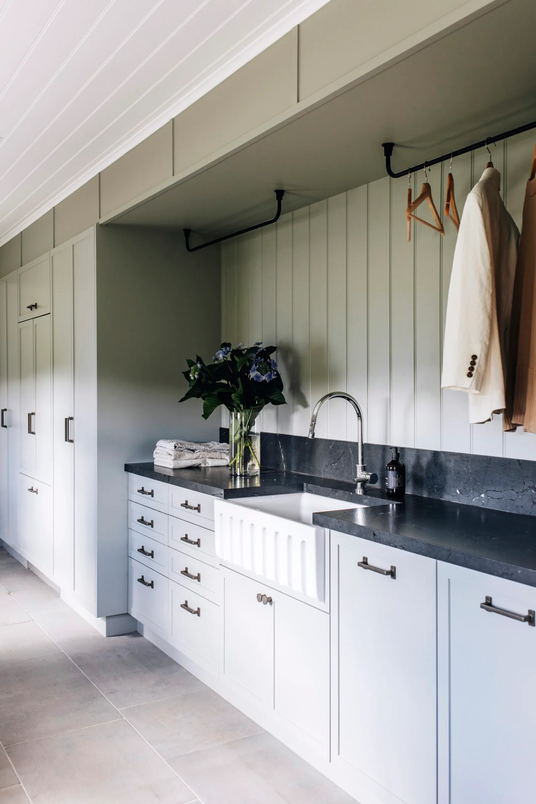 In the hardworking laundry and mudroom, Dulux Pozieres cabinetry pairs with SNB Stone Negresco quartzite benchtops and Surface Gallery ‘Toulon’ tumbled floor tiles. (Credit: Photography: Abbie Melle )