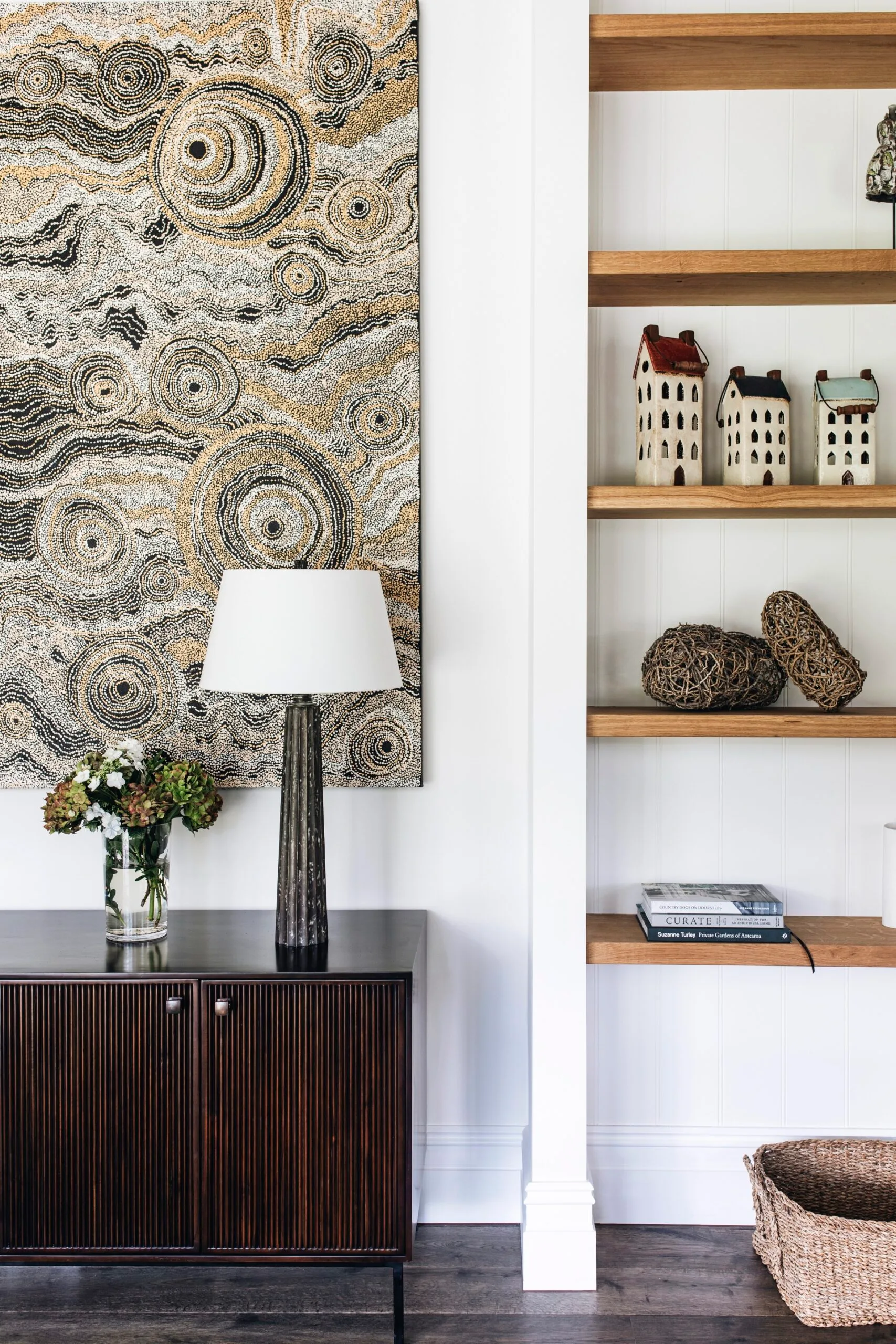 A Florabelle Living ‘Sass’ table and Canvas + Sasson ‘Sloane’ chairs in Moss greet the family at the entrance. The custom ‘Herringbone Granite Sisal’ rugs by Floorspace tone with solid timber shelves, crafted by Life Home Builders.
