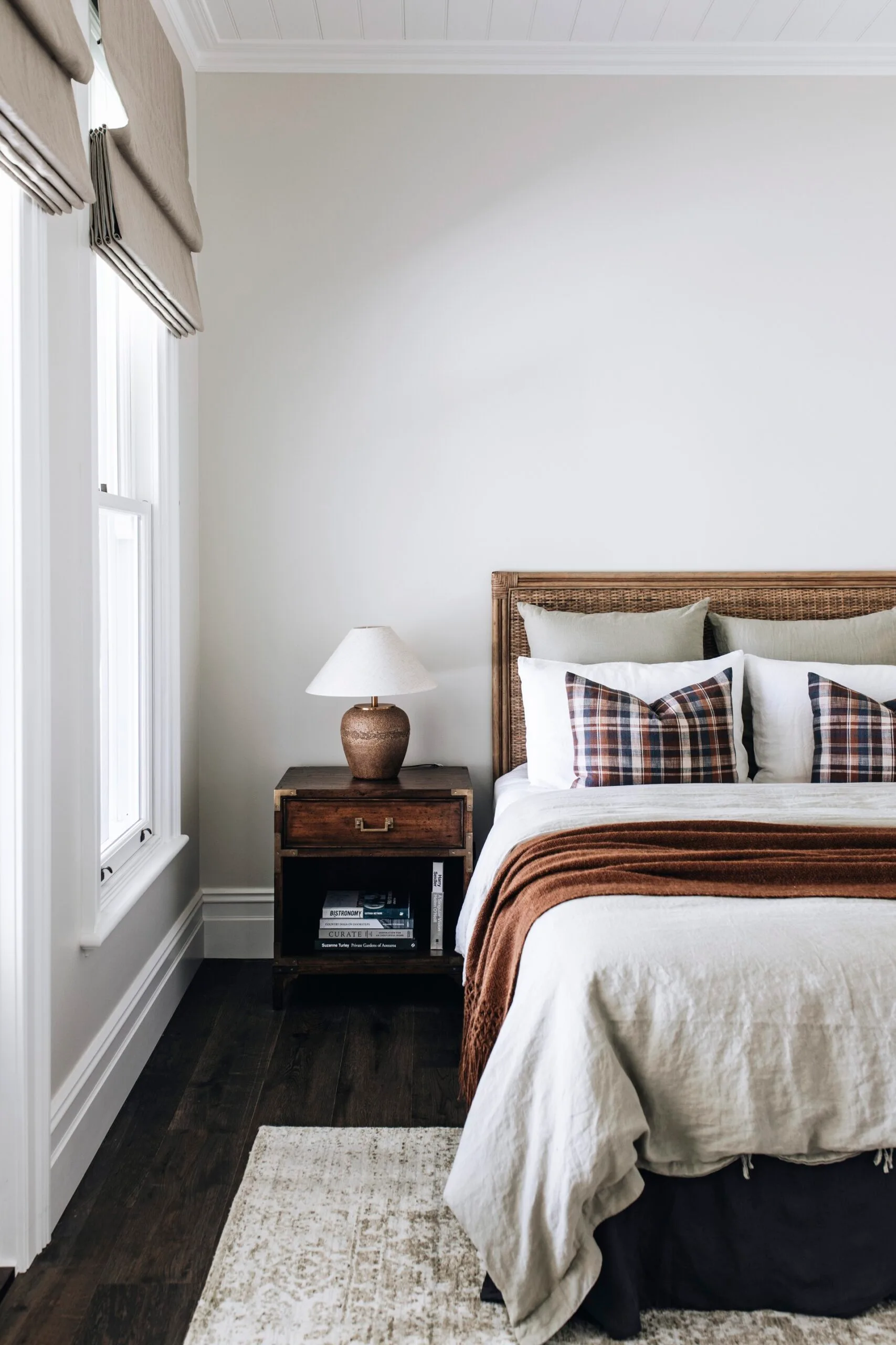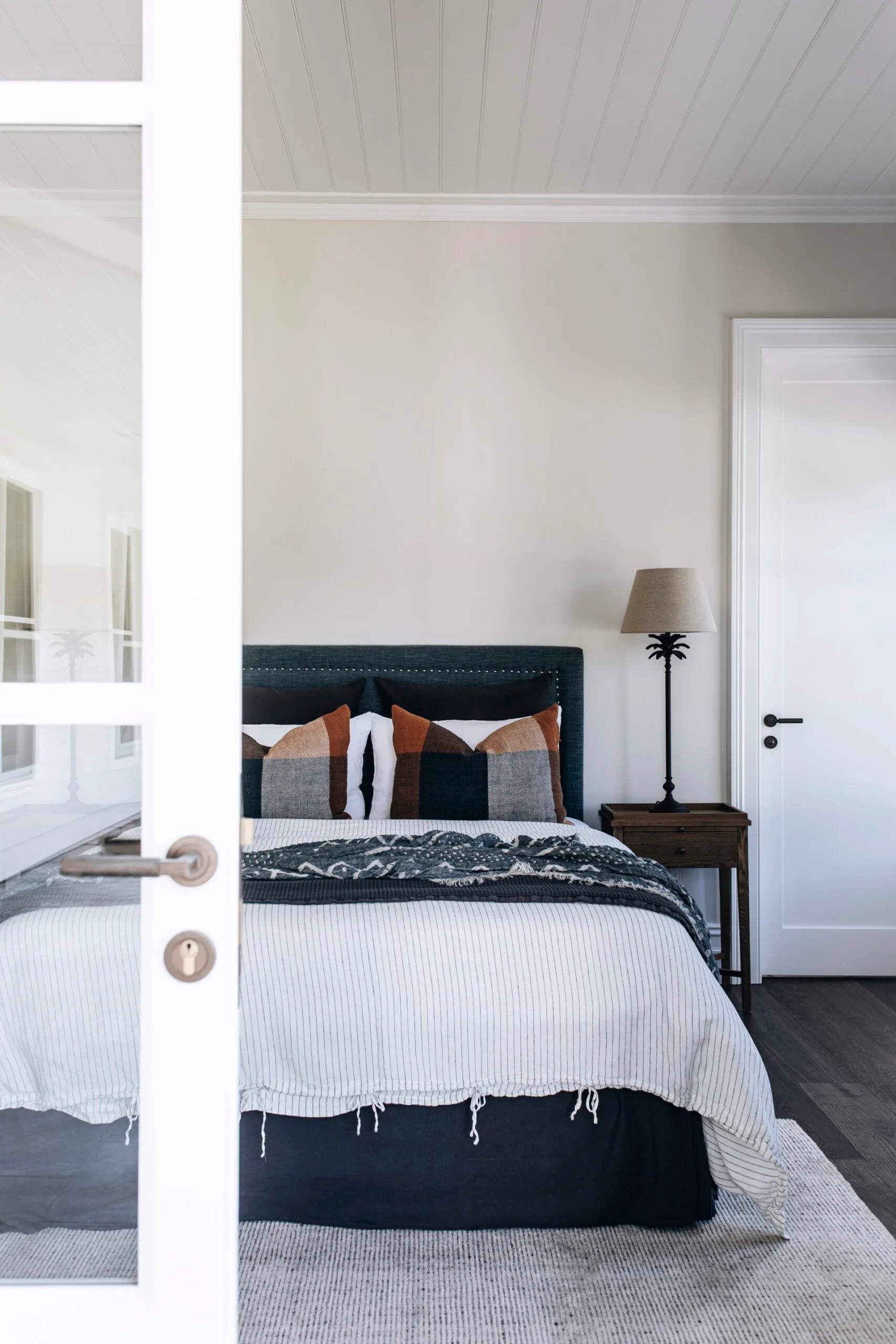 The serene guest room features a Florabelle ‘Lennox’ bedhead and Città handwoven ‘Miro’ cushions. A Tallira ‘Garcia’ rug in Oyster from The Rug Collection grounds the room, with an Emac & Lawton ‘Casablanca’ table lamp and French Country Collections ‘Saskia’ bedside table finishing the look. (Credit: Photography: Abbie Melle )
