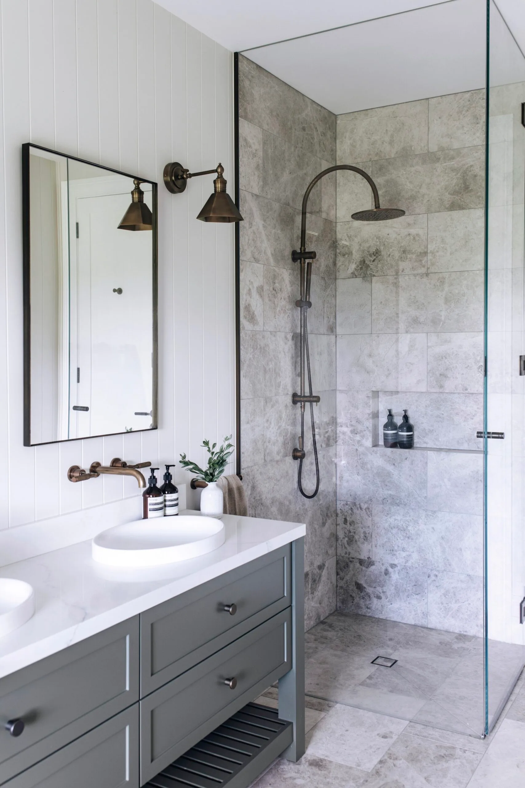 Dogal Light Grey tiles from Surface Gallery tone with the Smartstone-topped vanity in Dulux Strong Olive in the bathroom. Astra Walker tapware in Aged Brass adds character, while a ‘Dignity’ basin from ADP and ‘Mayfair’ sconce in Antique Brass from Emac & Lawton complete the luxe look. (Credit: Photography: Abbie Melle )