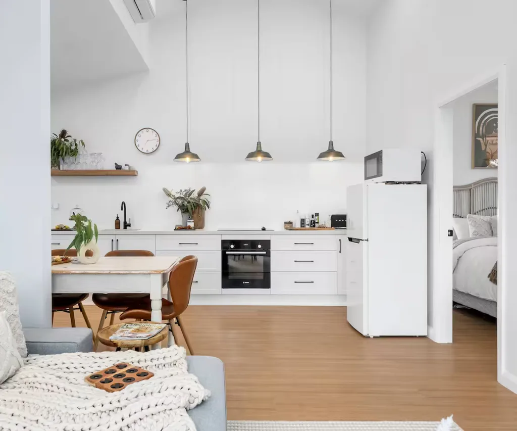 Situated within a stone’s throw of the Hawkesbury River in South Maroota, this luxury farm stay offers a charming homestead experience for a couple or small group. The elevated interiors and curated amenities are what make this country stay so special: from the luxury linens to the freestanding bathtub and outdoor entertainment area, complete with an outdoor firepit and BBQ. Spend the day stone fruit picking at Canoelands Orchard Farm, grab a bite at Wiseman’s Inn Hotel, or wander the Sunday markets at Windsor for some local produce and homemade goodies.