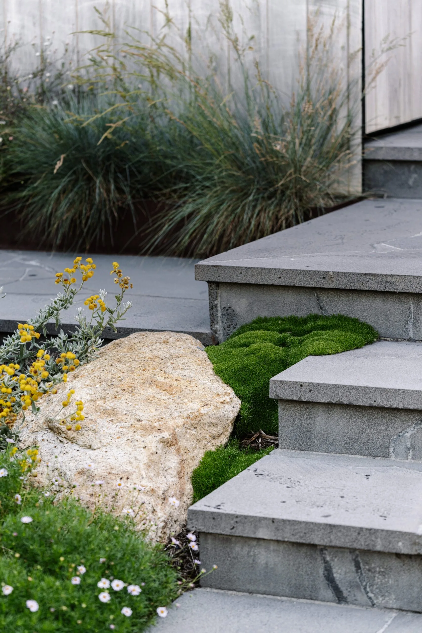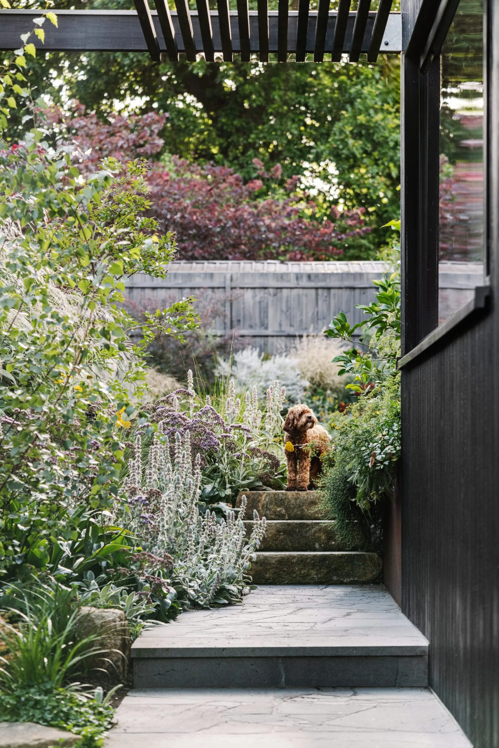 As busy professionals and parents, a low-maintenance design was essential. Lori opted for an organic tapestry of hardy, mostly native plants that don’t need regular watering, and locally sourced bluestone