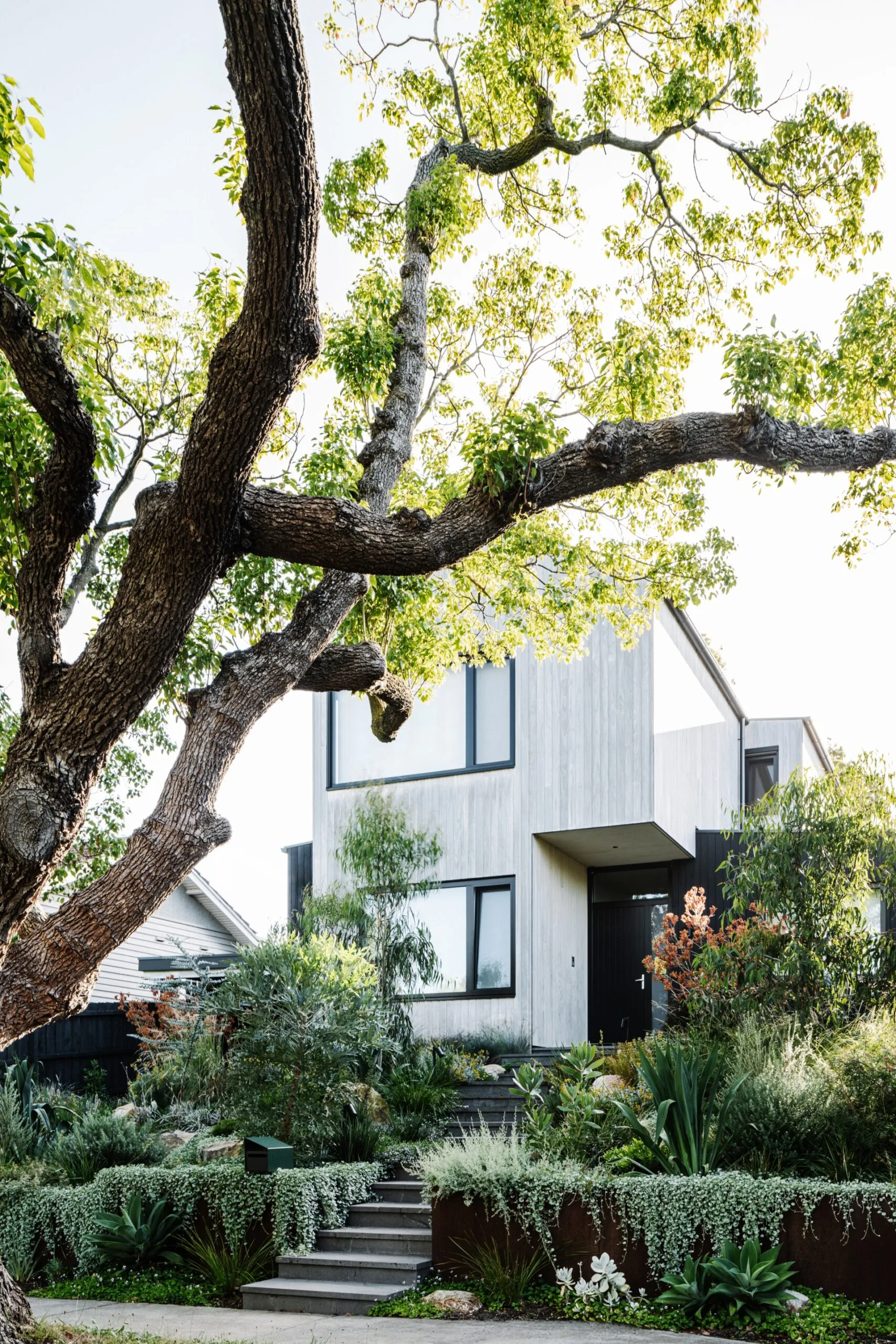 Homeowners Caroline and Nick, who have two young children, were keen to create a counterpoint to the formal hedges and cottage gardens typically seen in the suburb. Championing the surrounding environment was also important. “The house is very green in its footprint and uses local materials where possible, so we wanted to embrace the modern… and stay on the theme of Australian timbers and aesthetics in the garden,” Caroline explains.