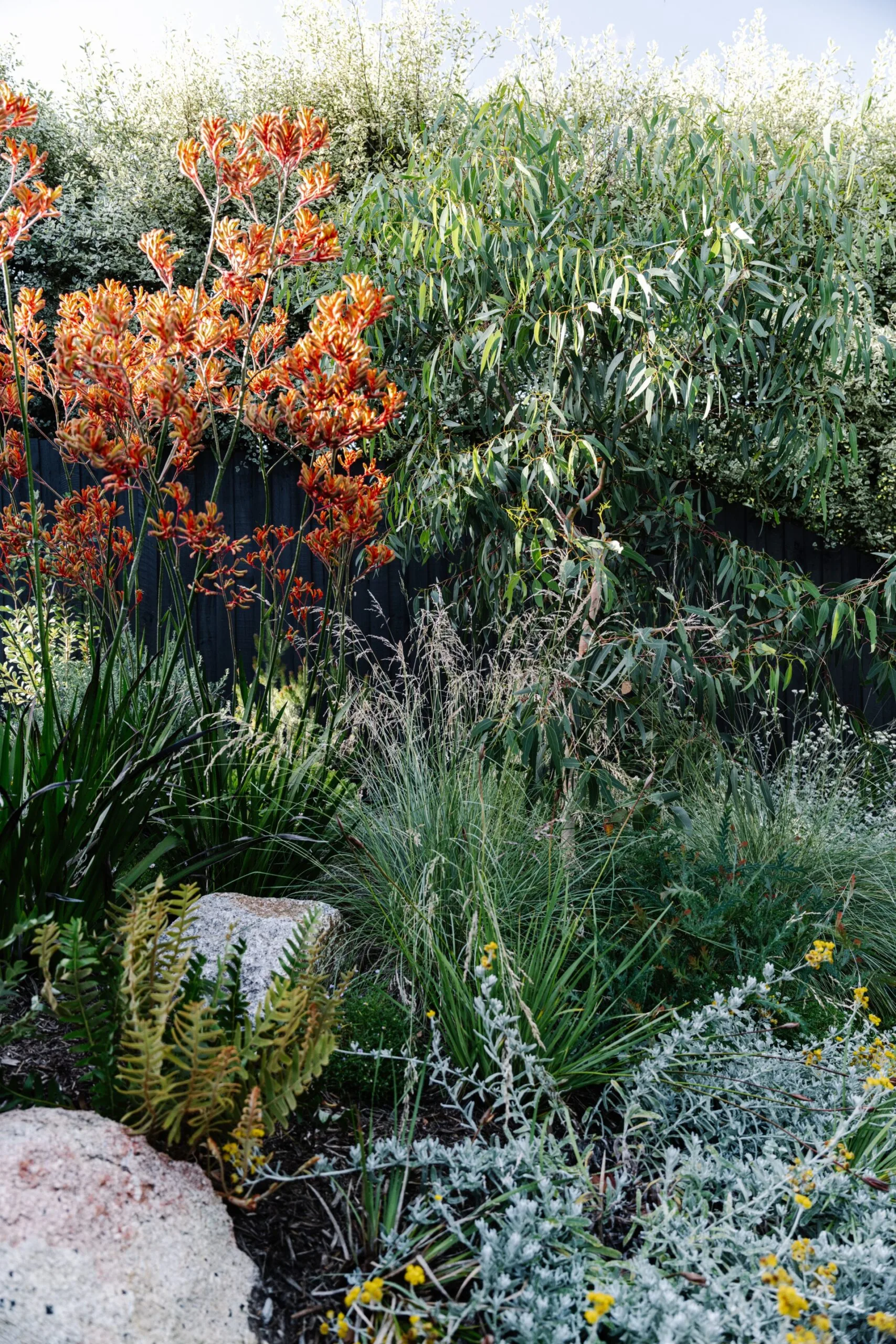 The garden has truly become a calming contrast to the busy city streets, while the native plants complement the natural beauty. “We love that it’s a little bit wild and rambling and that you get seasonal wildflowers,” Caroline says. “Our boys like to sit on the stone that’s a bit of a garden seat in the front yard and watch the first stars emerge and a few possums run around. You’re in a private native oasis there.”