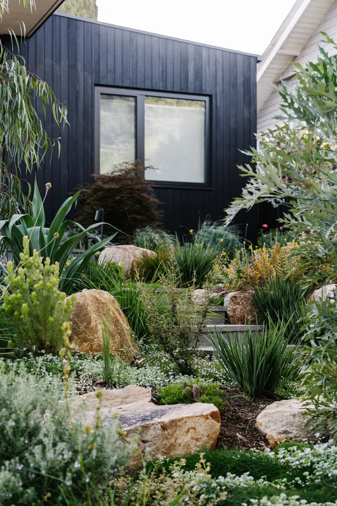 With foliage spilling over retaining walls and wildflowers popping up between boulders, this garden in an East Melbourne suburb is clearly thriving. It’s a far cry from the barren construction site it was built on. “The site was heavy yellow clay that you could definitely make a set of dishes out of,” recalls landscape designer Lori McNutt of McNuttnDorff Landscapes. “There were a lot of issues – the block’s quite steep and there was no drainage.”