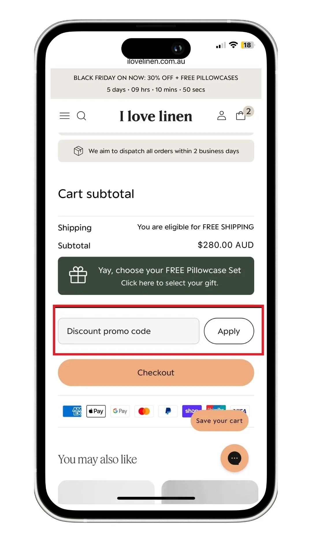 - Redeem your discount: Once you checkout, enter your promo code in the ‘discount code’ field in your cart view or alternatively add it in the ‘discount code or gift card’ field within your order summary at checkout. Once you click ‘apply,’ you’ll see your new total immediately.