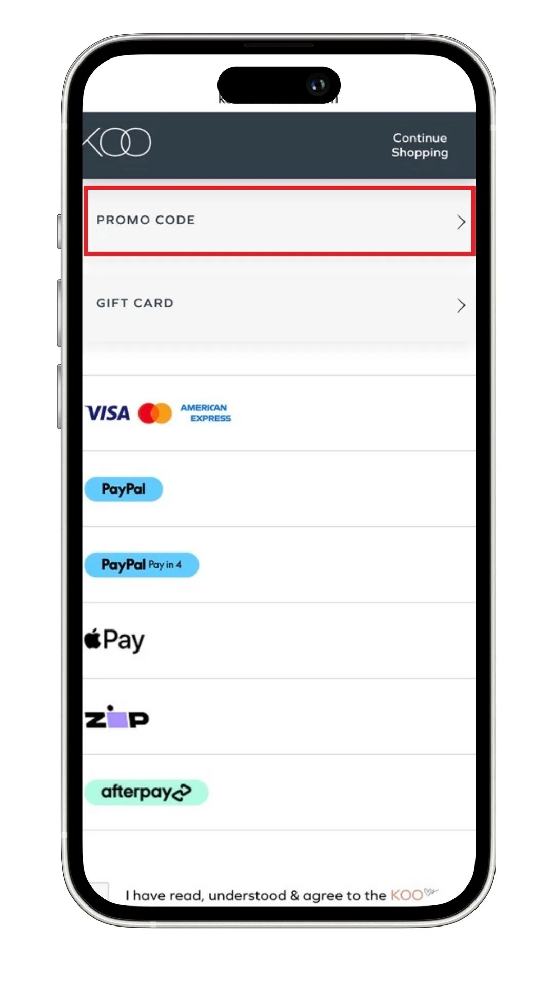 - Use your code: At checkout, after entering your email you can either join the KOO Club if you’re not already a member or continue as a guest. After adding in your delivery details you’ll reach the payment page where you’ll see the ‘promo code’ field. Add your code here and click apply to see your new total immediately.