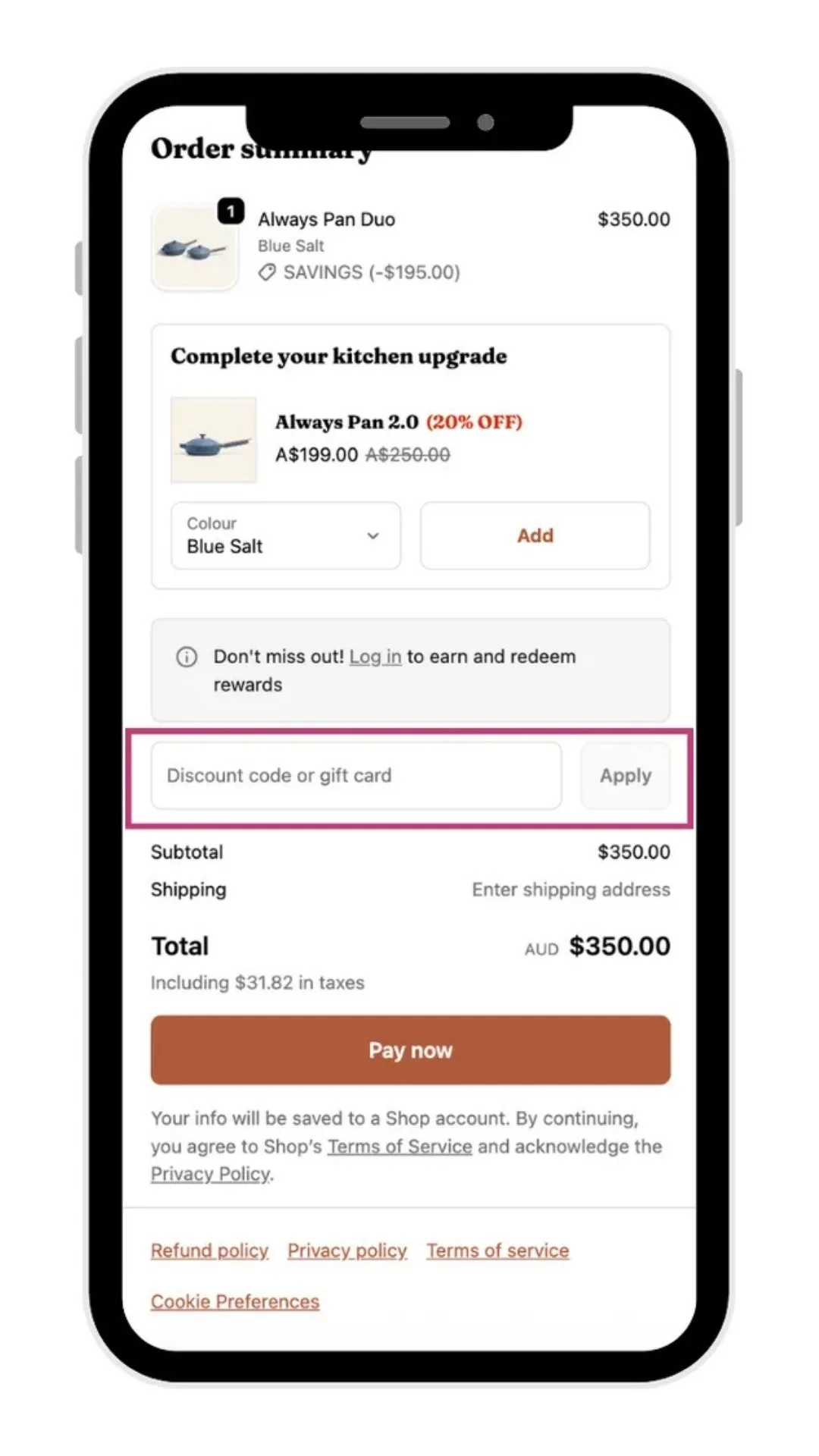 - Apply your discount: At checkout, locate the ‘Discount code or gift card’ field, enter your Our Place discount code and click ‘apply’ – your total updates immediately.