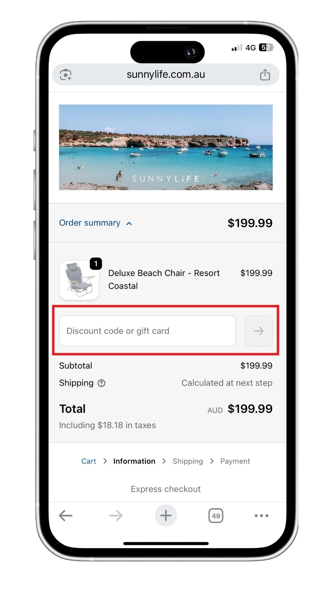 4. Apply your code or offer: When you reach checkout, locate the ‘Discount code or gift card’ field and enter your SUNNYLiFE coupon code. Click ‘Apply’ and your updated total appears immediately.