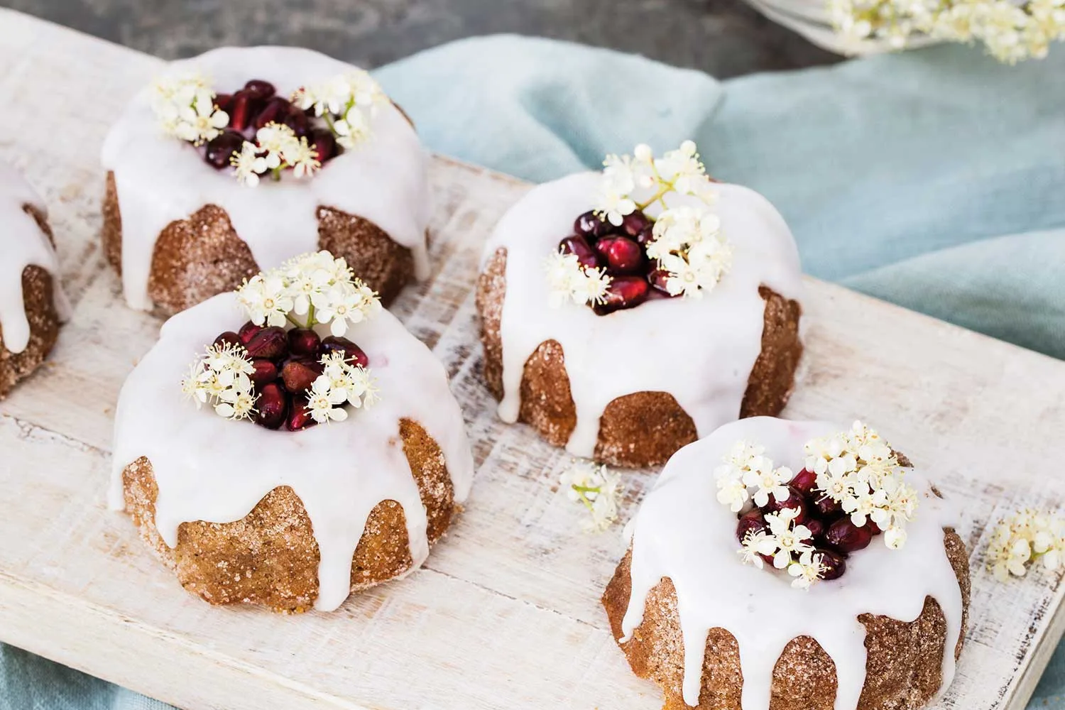 To make the icing, sift icing sugar into a bowl, add enough water to make a thick icing and stir until smooth. Spoon icing on top of each cake. Allow to set. Garnish with pomegranate and flowers. Serve.