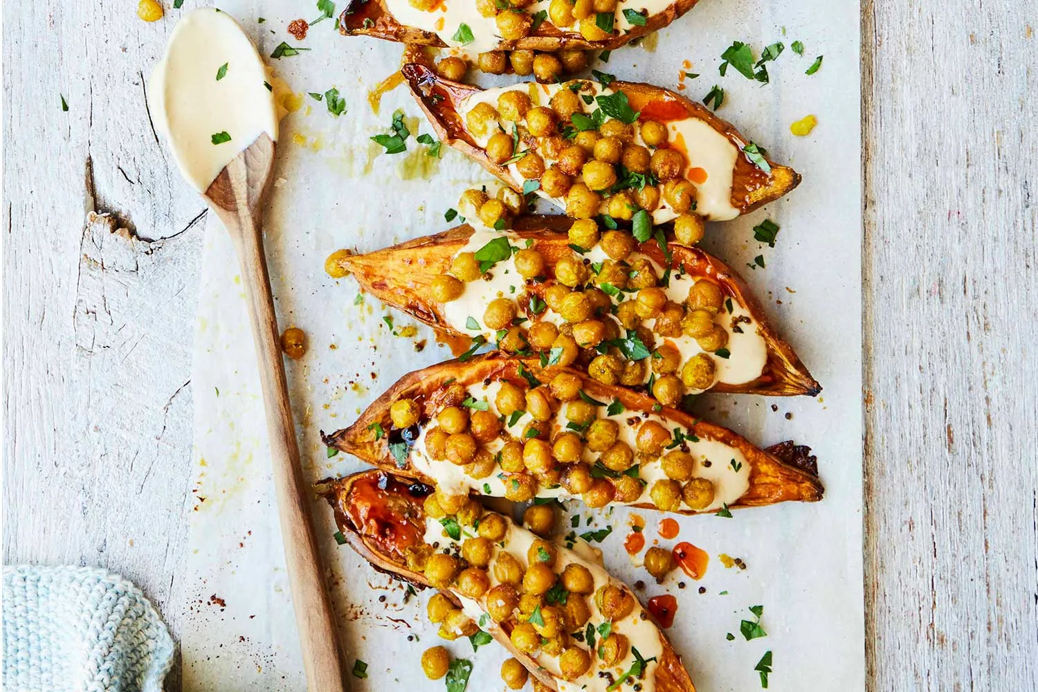 Add chickpea mixture to hot oil and shake to coat. Return to oven and roast for 20-25 minutes, stirring once or until beginning to crisp.