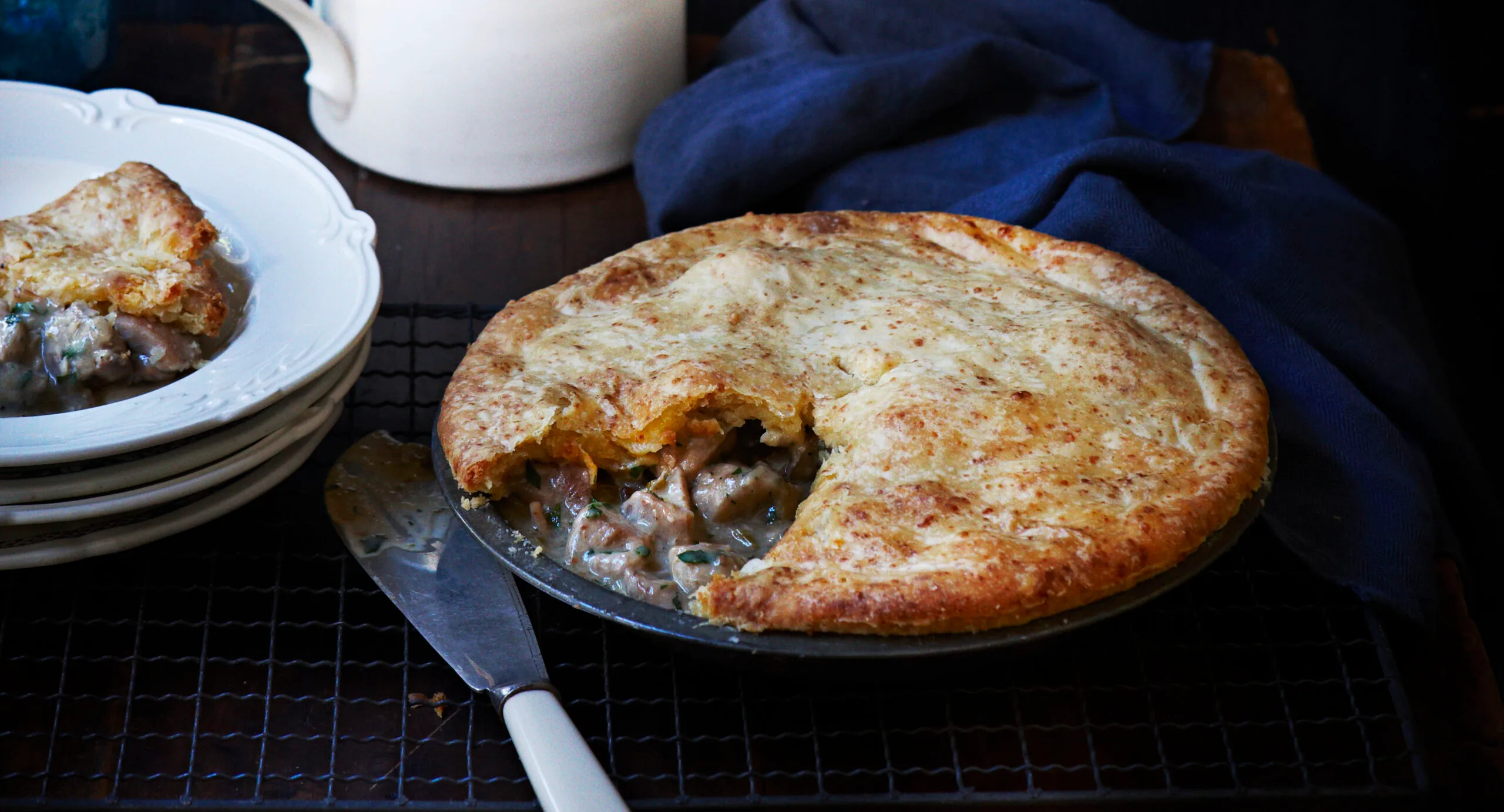 Roll out pastry on a floured surface until 7mm thick and large enough to cover pie dish. Wet edge of dish. Cover pie with pastry, then trim edges. Cut a cross in centre of pastry for venting. Bake 20-25 minutes or until golden. Serve.