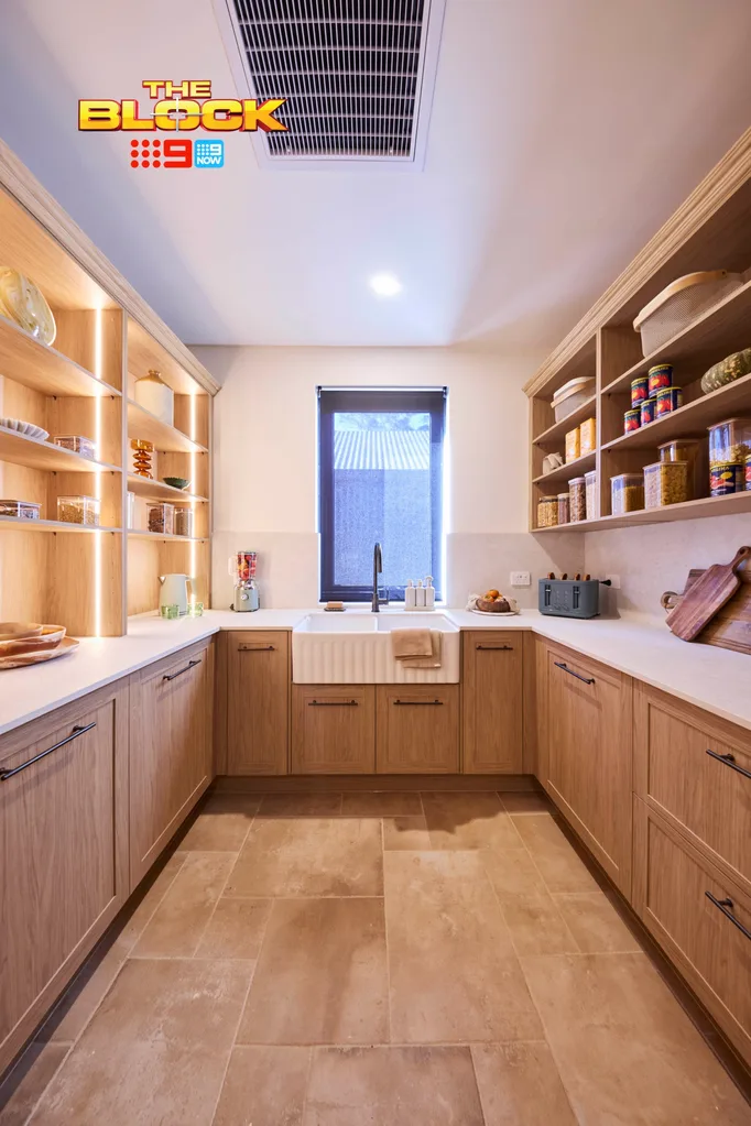 Robby and Mat went with a stylish light timber for their room butler’s pantry, featuring plenty of storage and a generous sink.