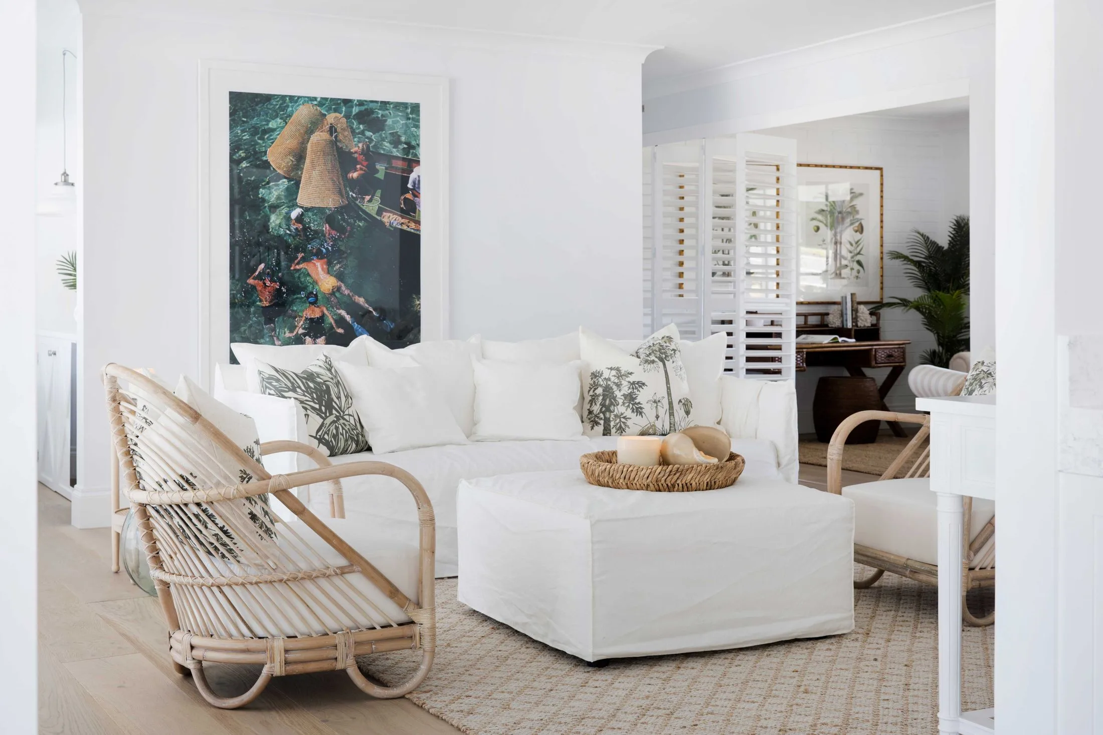 The dining area flows through to the casual lounge area. Here, the crisp, white Bronte lounge and ottoman from Lounge Lovers (the covers are removable for cleaning) and Slim Aarons Snorkelling In Malta print set a cool, calm mood.
