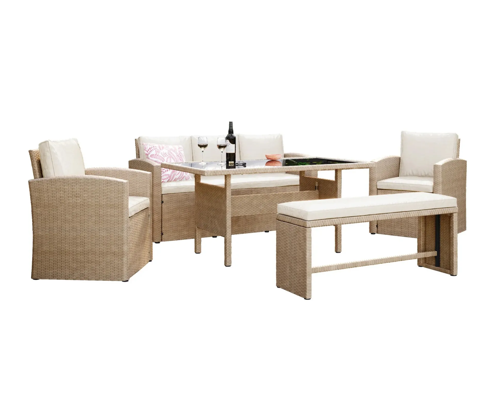 Spend family dinners under the late afternoon sun with the MAPA Outdoor Dining & Sofa Set, a stunning exterior staple designed to bring both elegance and ease to your alfresco space. Crafted with weather-resistant all-weather wicker in natural tones, this set seamlessly blends laid-back comfort with refined style. And with a generously sized rectangular table, two plush loungers and five matching chairs, it offers plenty of room for all occasions, from relaxed weekend breakfasts to lively evening gatherings.