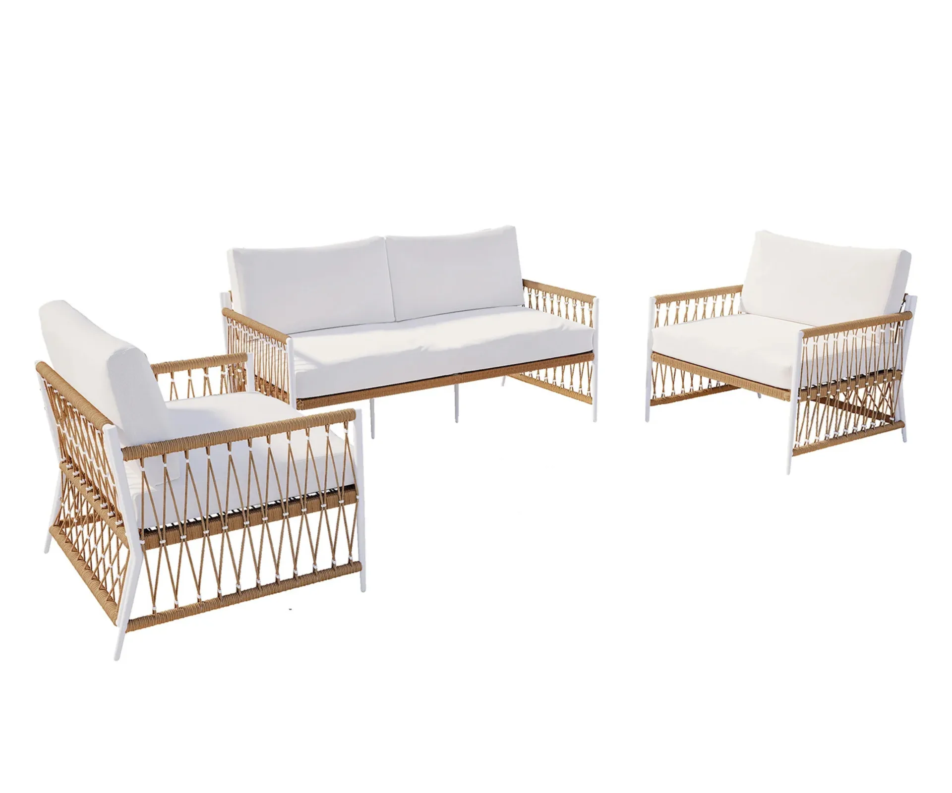 The woven polyester rope detailing on the back panels adds a touch of sophistication, while the generously padded cushions ensure comfort during long, leisurely afternoons. Perfect for those who appreciate understated elegance and quality craftsmanship, the Covey Sofa transforms your outdoor space into a serene retreat.