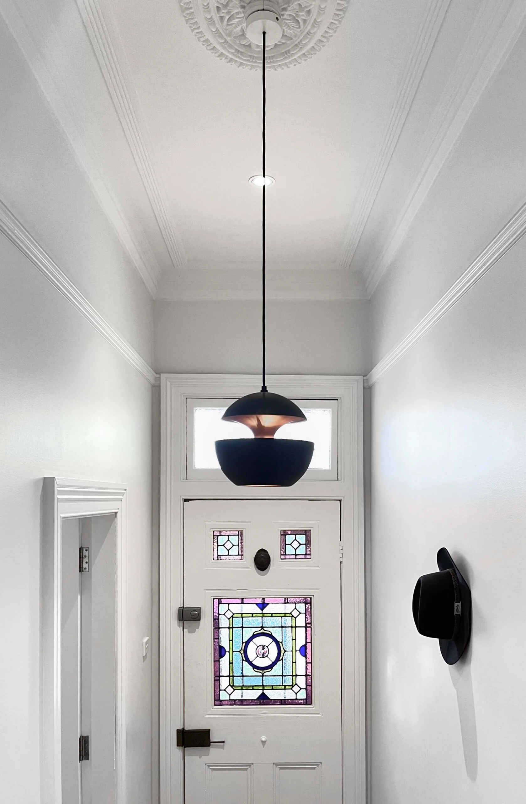 While wandering through Winnings in Alexandria, my husband and I spotted our old favourites, DCW Editions ‘Here Comes The Sun’ pendants, a range designed by French architect Bertrand Balas in 1970, and the glow they cast was as beautiful as ever. Shortly after, we surprised ourselves by becoming the proud owners of a 250-centimetre pendant in Black and Copper for our hallway, and a 450-centimetre pendant in White and Copper for the living area – the exact lights we had used and loved in a previous home makeover.