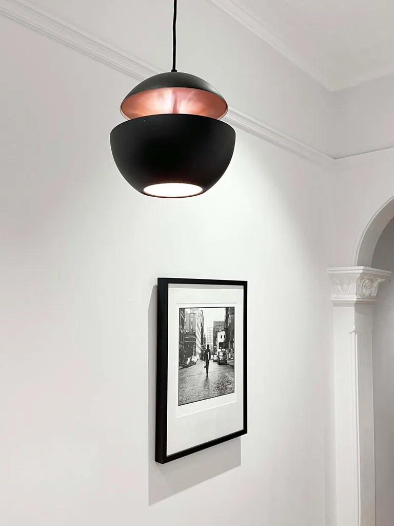 Even before I flicked the switch and turned these beauties on, they looked stunning. When not in use, the Copper internal finish is a soft pink metallic tone and the lines are architectural and sculptural; when switched on, the pendants bathe our hall and living room with a warm, gilded glow.