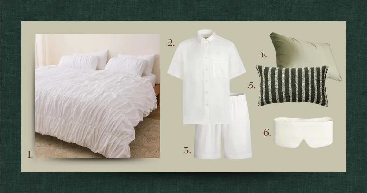 1. Sofia Ruched Cotton White Duvet Set, Sheet Society 2. Jules Short Sleeve Shirt in Cream, Resting 3. Kit Short in Cream, Resting 4. Fleur Silk Sage Pillowcase, Sheet Society 5. Hunter Green Stripe Cushion, Sheet Society 6. Cleo Eyemask in Cream, Resting | Background: Warwick Chambray Cushion, The Fabric Editors