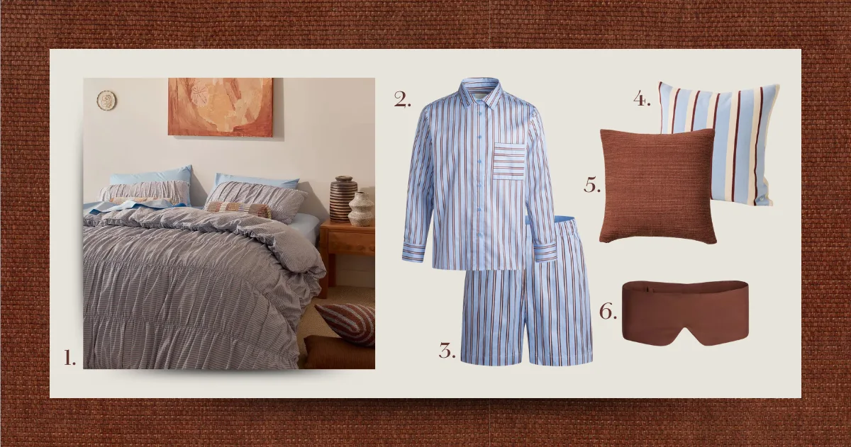 1. Sofia Ruched Cotton Duvet Set in Marni Stripe, Sheet Society 2. Jules Long Sleeve Shirt in Solace Stripe, Resting 3. Kit Short in Solace Stripe, Resting 4. Murphy Stripe Cushion Cover, Sheet Society 5. Nutmeg Rib Square Cushion Cover, Sheet Society 6. Cleo Eye Mask in Chocolate, Resting | Background: Warwick Pushka Fabric, The Fabric Editors