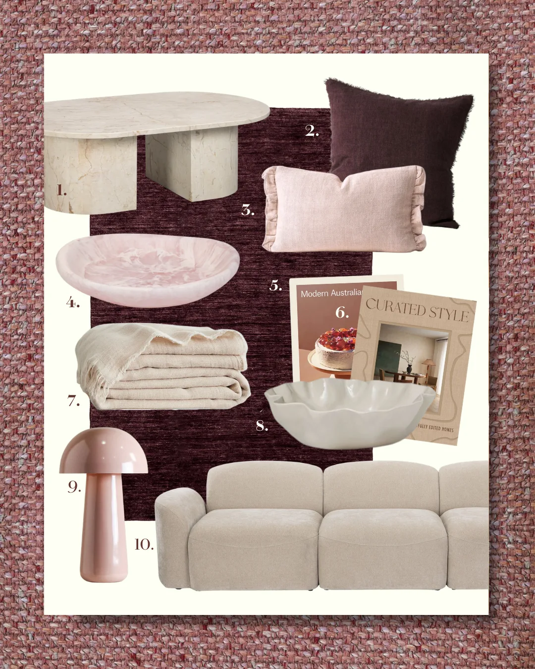 1. Idle Coffee Table, RJ Living. 2. Vintage Linen Fringe Cushion, Aura Home. 3. Ruffle Linen Cushion, Aura Home. 4. Large Bones Bowl, Dinosaur Designs. 5. Modern Australian Baking, Aura Home. 6. Curated Style, Aura Home. 7. French Flax Linen Throw, Bed Threads. 8. Ruffle Bowl, Aura Home. 9. Bluff Table Lamp, Aura Home. 10. Cami Chenille Modular Sofa, Temple & Webster | Background: The Fabric Editors.