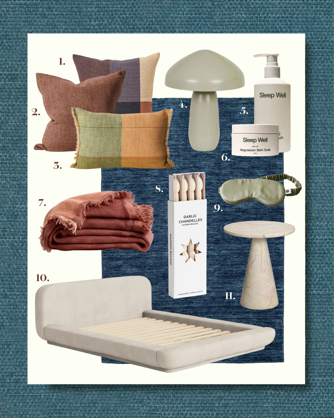 1. Albers Cushion, RJ Living. 2. Heavy Linen Cushion, Aura Home. 3. Sol Cushion, RJ Living. 4. Easton Curve Table Lamp, Globewest 5. Calming Sleep Wash, Sheet Society. 6. Sleep Well Magnesium Bath Soak, Sheet Society. 7. Cacao & Hazelnut Muslin Throw, Bed Threads. 8. Garlic Chandelles, Maison Balzac. 9. Fleur Silk Eye Mask, Sheet Society. 10. Floss King Bed, RJ Living. 11. Brooks Medium Side Table, RJ Living. | Background: The Fabric Editors.